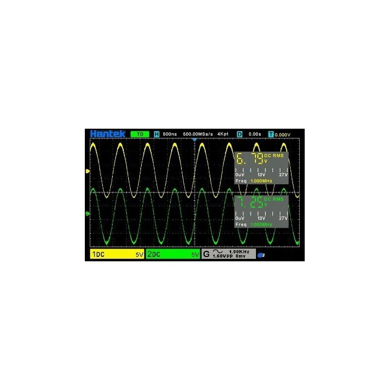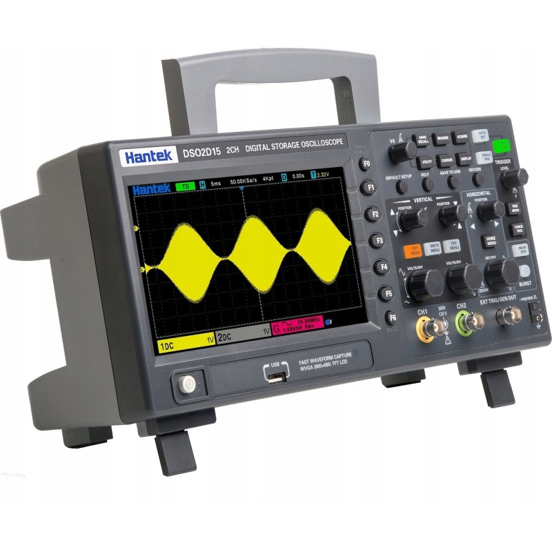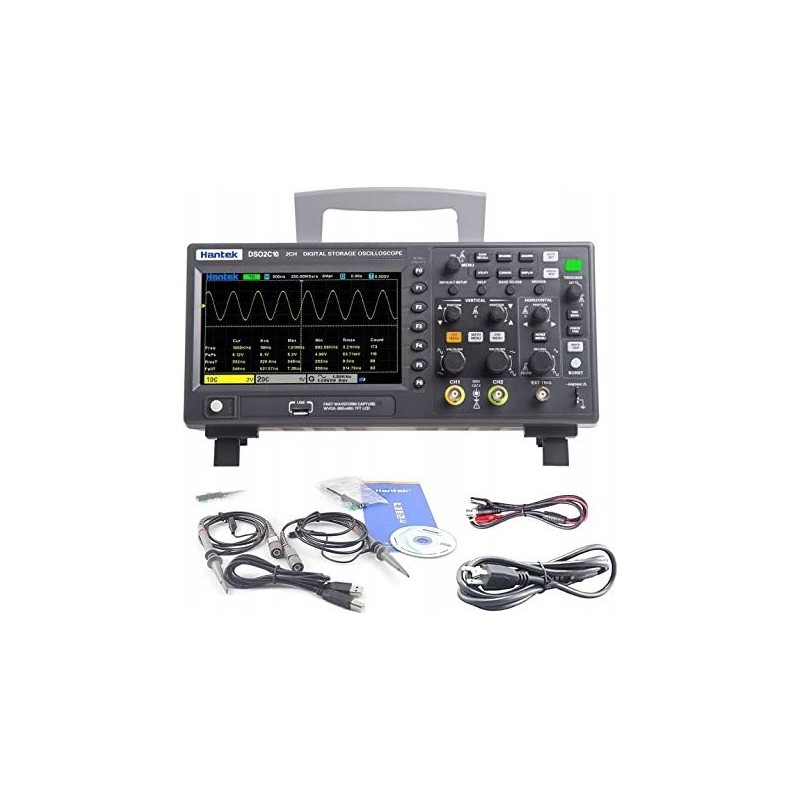 Das Oszilloskop DSO2C10 ist mit einem großen 7-Zoll-TFT-Farbdisplay mit einer hohen Auflösung von 800x480 ausgestattet. Wenn Sie ein einfaches Digitaloszilloskop für Servicezwecke in der Werkstatt oder für einen elektronischen Hobbyanfänger suchen, scheint das Modell DSO2C10 der ideale Kompromiss zu sein. Das Hantek-Oszilloskop DSO2000 ermöglicht die Beobachtung von Signalen bis zu 100 MHz, was ein angemessener Wert ist.