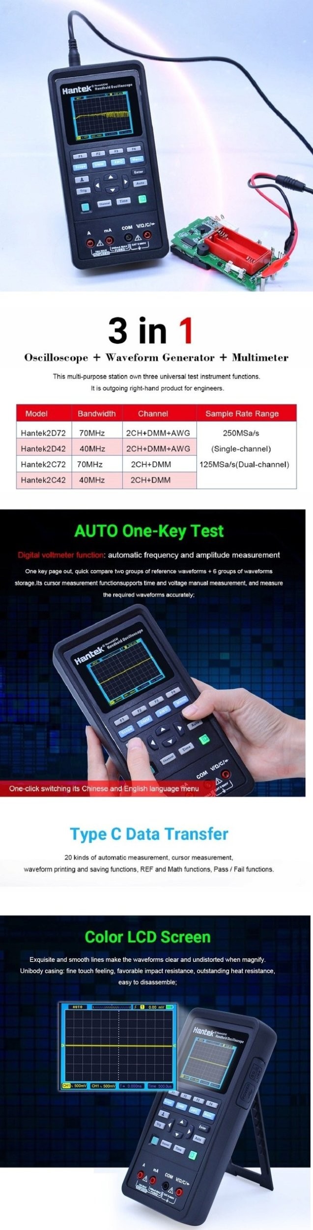 Das Hantek 2C42 verfügt über zwei Eingangskanäle, was die gleichzeitige Überwachung und Analyse von Signalen ermöglicht. Dank seiner kompakten Abmessungen ist es leicht zu transportieren und bequem zu bedienen, was es zur idealen Wahl sowohl für den Einsatz vor Ort als auch in Laboren macht.