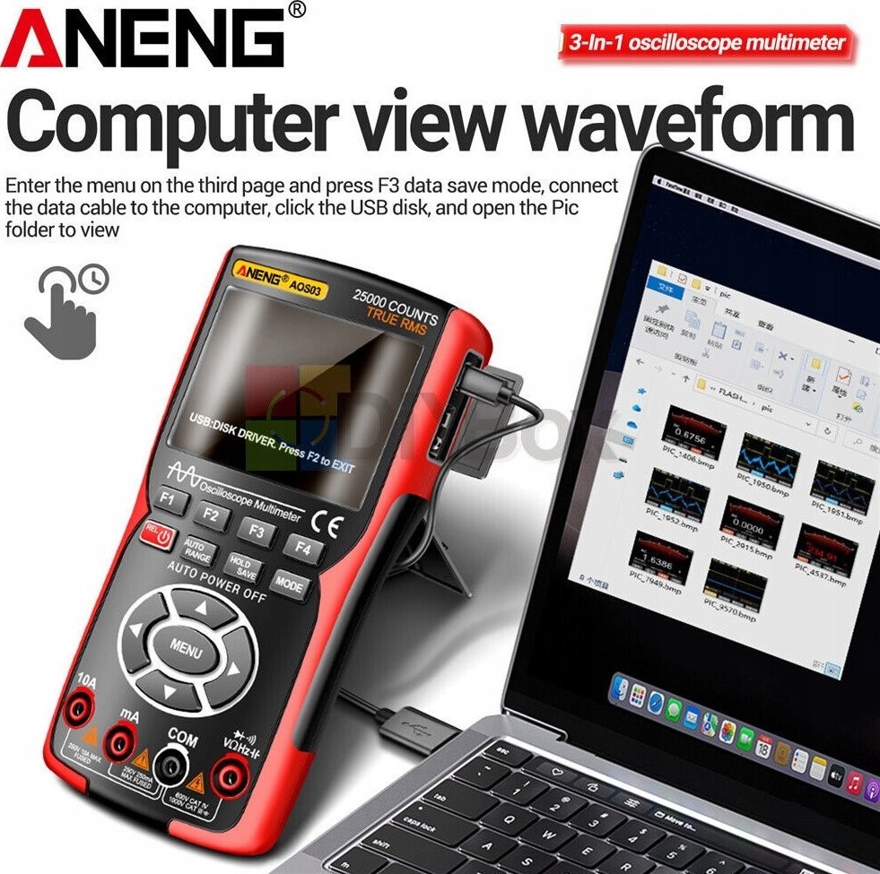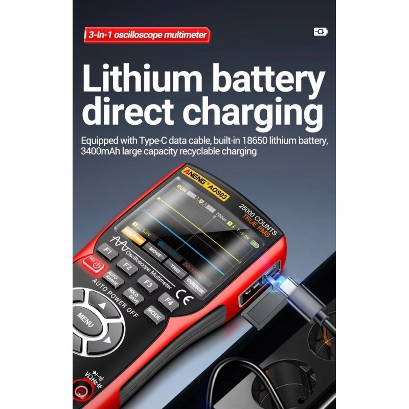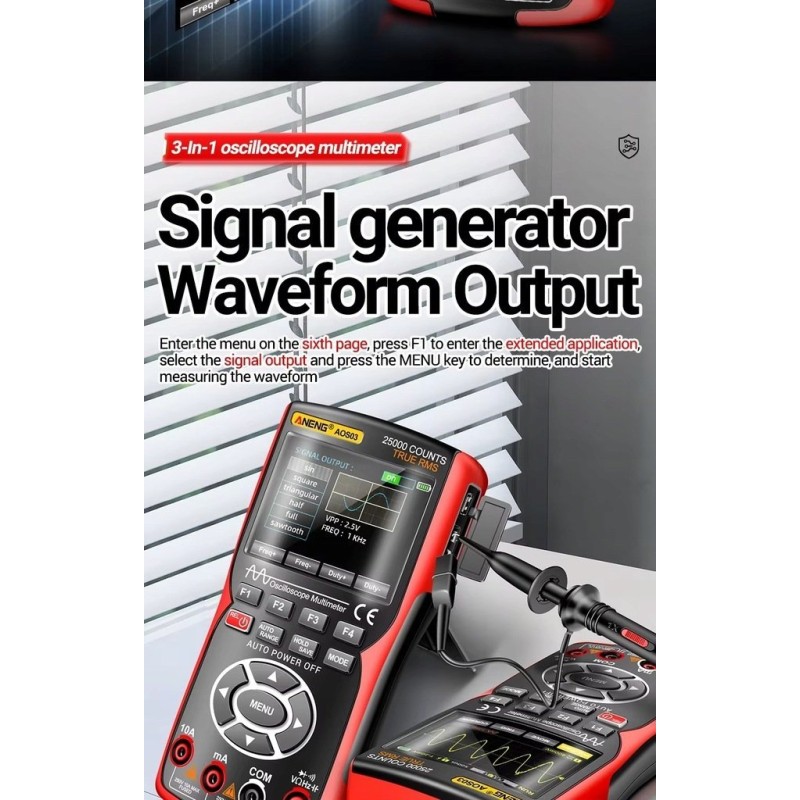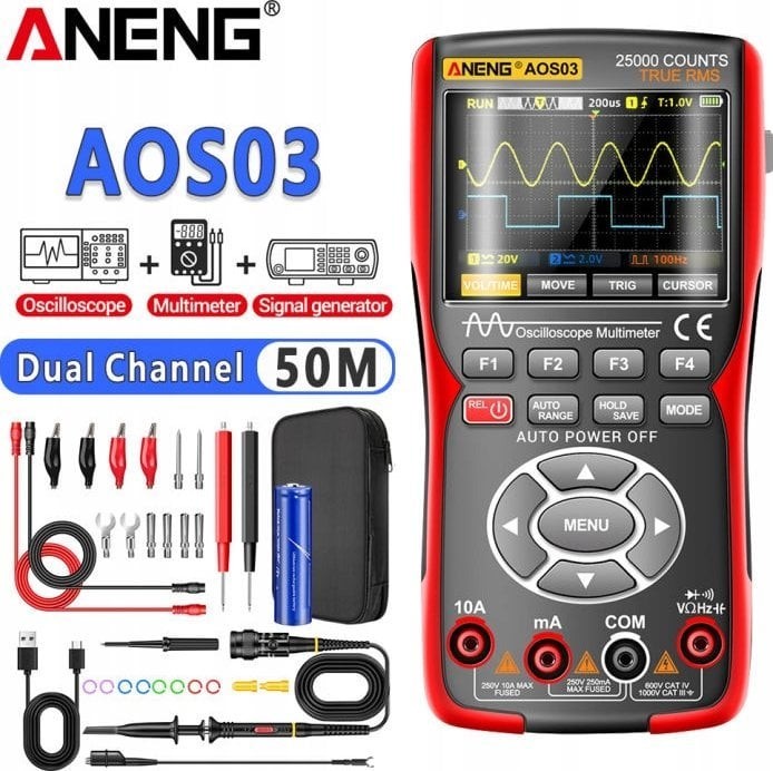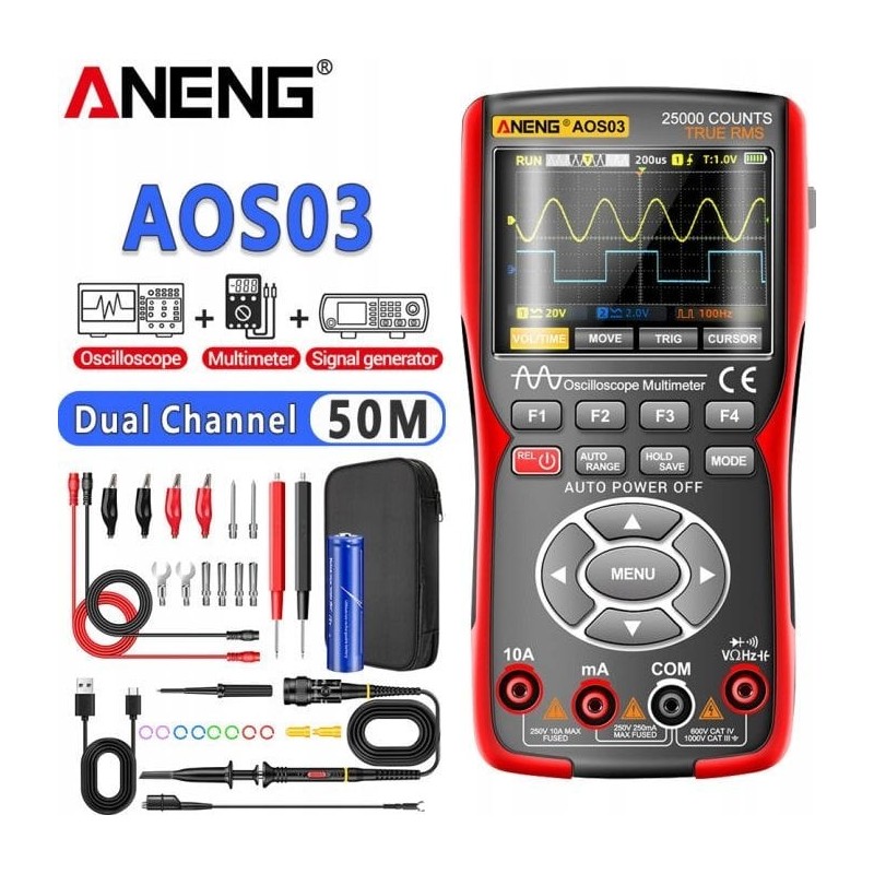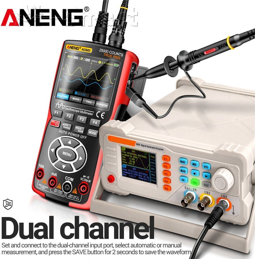 Das ANENG AOS03 ist ein vielseitiges 3-in-1-Gerät, das die Funktionen eines Zweikanal-Oszilloskops, eines digitalen Multimeters und eines Signalgenerators vereint. Dank seiner kompakten Abmessungen, seines ergonomischen Designs und seines umfangreichen Funktionsumfangs eignet es sich ideal für Ingenieure, Techniker, Studenten und Hobbybastler.