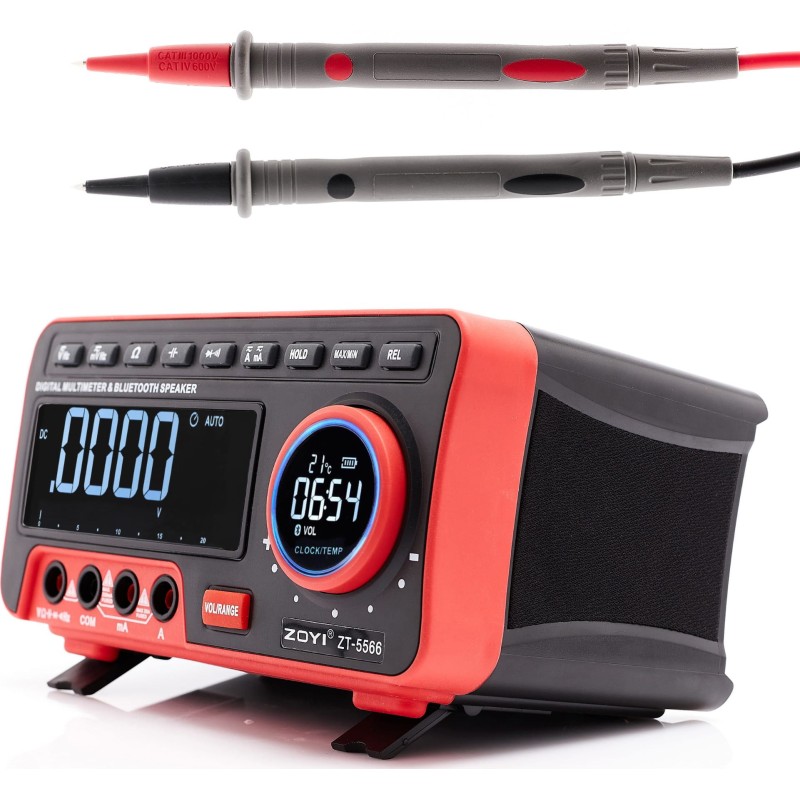 Digitales Multimeter mit Echt-Effektivwert-Messung (RMS), was seine hohe Genauigkeit bestätigt. Das Messgerät ist mit einer Uhr, einem Wecker und einer Bluetooth-Lautsprecherfunktion zur Musikwiedergabe ausgestattet und verfügt zudem über ein separates Temperaturdisplay. Dank der Bildschirmbeleuchtung und der Datenhaltungsfunktion können Benutzer problemlos in dunkler Umgebung arbeiten. Mit ihm lassen sich unter anderem Spannung und Stromstärke (AC/DC), Widerstand, Kapazität, Frequenz und Tastverhältnis messen.