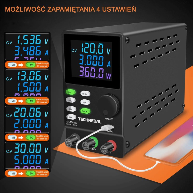 Der Techrebal SPPS-3010D ermöglicht das Speichern von bis zu vier verschiedenen Einstellungen, was die Arbeit in unterschiedlichen Umgebungen erheblich erleichtert und beschleunigt. Dank dieser Funktion kann der Benutzer schnell zwischen den am häufigsten verwendeten Parametern wechseln, was die Arbeitseffizienz erhöht.
