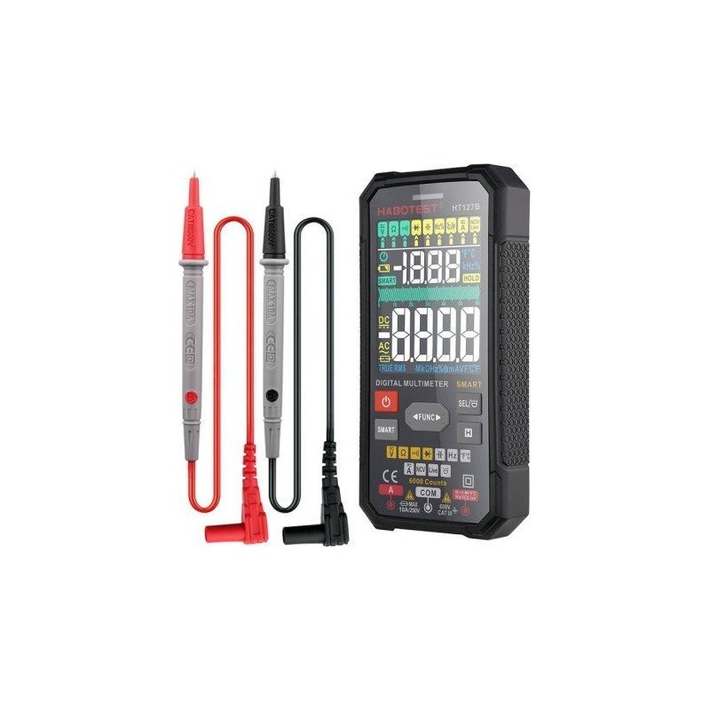 Digitales Multimeter Habotest HT127B Das digitale Multimeter Habotest HT127B ist ein multifunktionales Gerät, das sich bei Elektroarbeiten bewährt. Das Produkt ermöglicht die Messung von Spannung, Widerstand, Kapazität und vielen anderen Parametern. Das Multimeter verfügt über ein gut lesbares Display, auf dem sich die Messergebnisse bequem ablesen lassen, und ist zudem mit einer Taschenlampe und praktischen Tasten ausgestattet. Viele nützliche FunktionenDas digitale Universal-Multimeter Habotest HT127B ist ein handliches Gerät, das durch seine vielfältigen Möglichkeiten überrascht. Es ermöglicht unter anderem die hochpräzise Messung von AC- und DC-Spannung und -Strom, Widerstand, Temperatur oder Kapazität. Darüber hinaus bietet es eine Live-Test-Funktion, ermöglicht das Testen von Dioden, die berührungslose Spannungserkennung (NCV) und vieles mehr. Wichtig ist, dass das Multimeter über praktische Tasten verfügt, mit denen Sie die gewünschte Funktion schnell auswählen können. Gut durchdacht Dank seiner kompakten Abmessungen (71,5 x 26 x 145 mm) liegt das Gerät gut in der Hand und bietet hohen Bedienkomfort. Die Stromversorgung erfolgt über vier AAA-Batterien, die Sie mühelos entnehmen und austauschen können. Das Gehäuse aus weichem Material fühlt sich angenehm an, bietet zudem eine wirksame Isolierung und ist sturzsicher.Im Lieferumfang enthaltenDigitales Universal-MultimeterMessleitungenBedienungsanleitungTechnische Daten:Hersteller: Habotest Modell: HT127B Messbereich Gleichspannung: 600 mV/6 V/60 V/600 V Messbereich Wechselspannung: 6 V/60 V/600 V Messbereich Gleichstrom: 600 mA/ 10 A Wechselstrom-Strommessbereich 600 mA/ 10 A Widerstandsmessbereich 600 Ω/6 kΩ/60 kΩ/600 kΩ/6 MΩ/60 MΩ Kapazitätsmessbereich 6 nF/60 nF/600 nF/6 µF/60 µF/600 µF/6 mFFrequenzmessbereich60 Hz/600 Hz/6 kHz/60 kHz/600 kHz/6 MHz/10 MHzDuty-Cycle-Messbereich1,0~99,0 %Temperatur (°C/°F) -40 °C ~ 1000 °C / -40 °F ~ 1832 °F Diodentest Ja, 0~3 VNCV Ja, akustischer und optischer Alarm Live-Test Ja, akustischer und optischer AlarmDurchgangsprüfung<50 ΩZählbereich6000AnzeigeVADatenspeicherungJaEchtwert-RMSJaFunktion zur Anzeige einer durchgebrannten SicherungJaAnzeige für niedrigen BatteriestandJaAutomatische AbschaltungJaAnzeige für EingangsbuchseJaHintergrundbeleuchtungJaTaschenlampeJaStromversorgung: 4x 1,5-V-AAA-Batterien Sicherheit: EN61010-1, CAT III 600 V Abmessungen: 145 x 71,5 x 26 mm