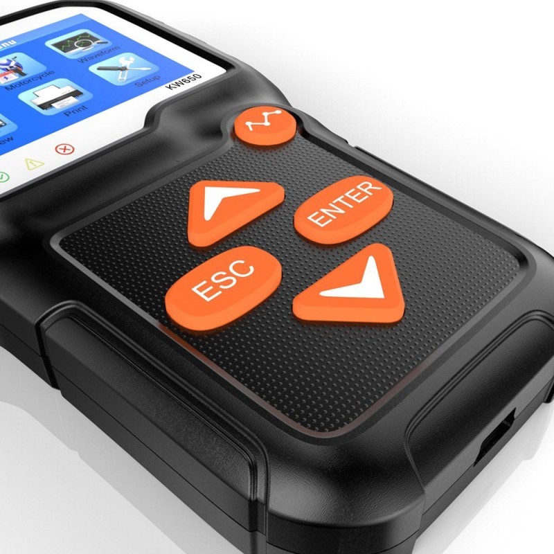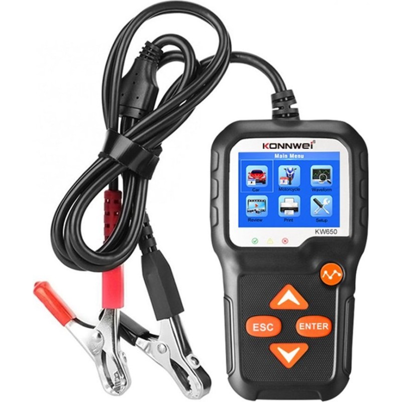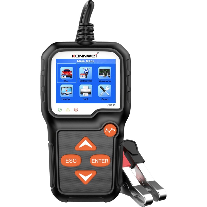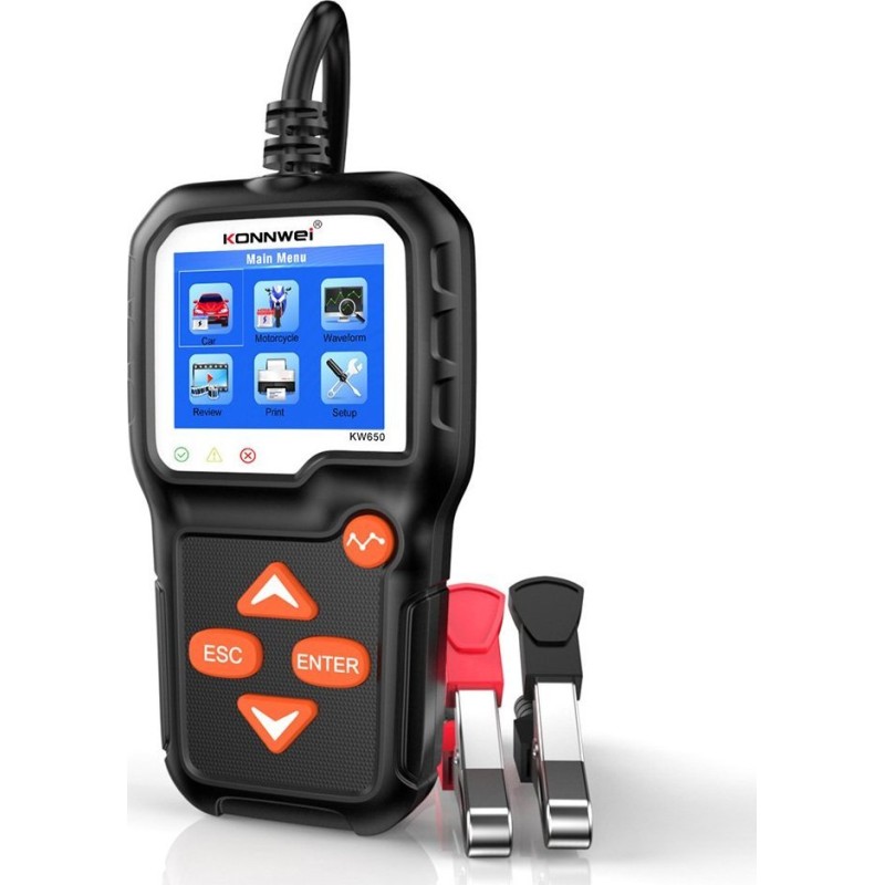 Konnwei KW650 Batterietester Der Konnwei KW650 Autobatterietester ist in der Lage, wichtige Fahrzeugdaten wie Spannung, Innenwiderstand, Kaltstartstrom und Kapazität in Ah effizient zu analysieren und anzuzeigen. Darüber hinaus berechnet das Gerät die Kaltstartleistung und den Alterungsgrad, was schnellere und präzisere Reparaturen am Fahrzeug ermöglicht. Unabhängig davon, ob Sie Anfänger oder Experte sind, kann dieser Kfz-Batterietester mit einer breiten Palette von 6-18-V-Batterien mit einer Kapazität von 100 bis 2000 CCA verwendet werden, darunter herkömmliche Batterien, flache AGM-Batterien, gewickelte AGM-Batterien und Gel-Batterien. Die Testergebnisse werden sowohl in Textform als auch in Form von Diagrammen angezeigt, und die aktuelle Batteriespannung wird als Wellenform dargestellt. Dank des intelligenten 2,4-Zoll-LCD-Bildschirms sind die Messwerte präzise und schnell ablesbar! Messspannungsbereich: 6 – 16 V Gemessene Parameter: SOC, SOH, Widerstand Stromversorgung: über die angeschlossene Batterie Display: LCD Abmessungen: 142 x 80 x 20 mm Betriebstemperatur: 0 °C bis 50 °C Sprachen: Englisch, Deutsch, Französisch, Spanisch, Italienisch, Portugiesisch, Polnisch, Niederländisch