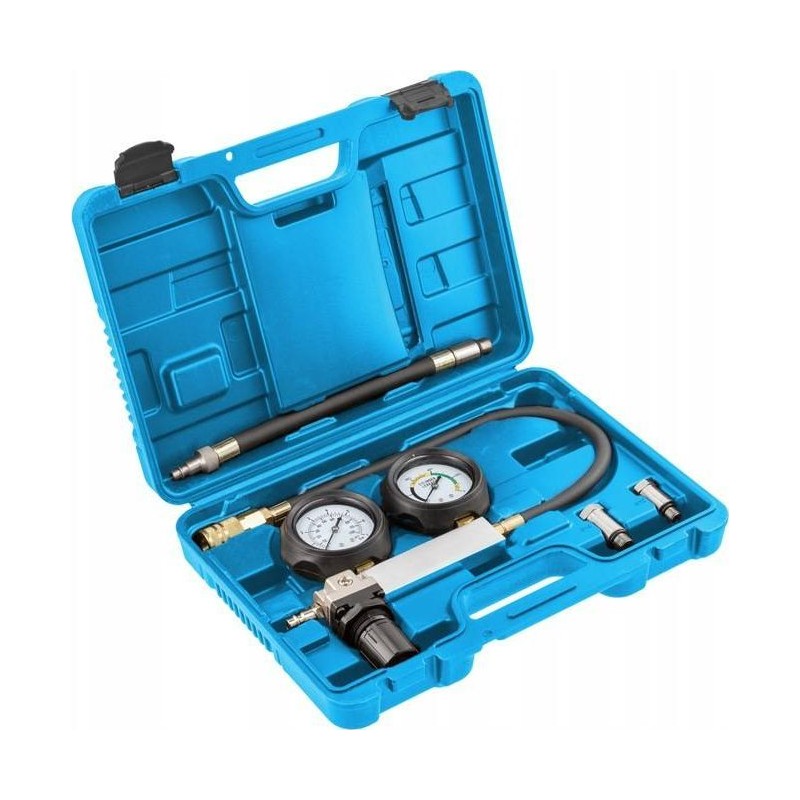 Die Zylinder-Dichtheitsprüfung bei Benzinmotoren ermöglicht die Diagnose von Fehlern wie Rissen im Zylinderkopf, verschlissenen Kolbenringen und Ventilen oder durchgebrannten Dichtungen. Er zeigt den Grad der Undichtigkeit des Zylinders und den Druck im Motor an. Der Indikator besteht aus widerstandsfähigen und zugleich leichten Materialien. Zusätzlich sind die Anzeigen mit einer stoßdämpfenden Gummiabdeckung ummantelt. Die Teile sind mit Schnellkupplungen für eine einfache und schnelle Montage ausgestattet. Wird hauptsächlich in Kfz-Werkstätten eingesetzt.