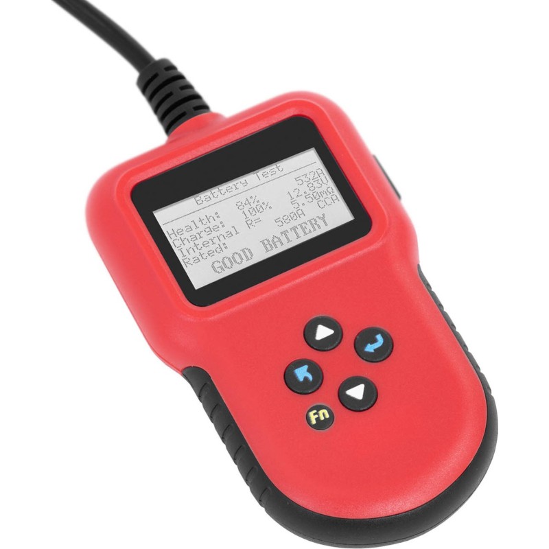 ein schnelles, klares und genaues Ergebnis. Die Werte werden automatisch gespeichert und verglichen. Das Messgerät prüft: Ladezustand (SOC), Kaltstartleistung (CCA), Spannung, Innenwiderstand, Lade- und Startkreise. Das Messgerät prüft den Zustand der Batterie mittels moderner Leitfähigkeitsmessung und nicht wie bei herkömmlichen Methoden, bei denen die Batterie durch den Einsatz eines Lastwiderstands entladen wird. Das digitale Batteriemessgerät sendet eine Reihe von Spannungsimpulsen aus und misst den daraufhin fließenden Wechselstrom. Dies liefert schnelle und zuverlässige Informationen über die verbleibende Kapazität und Leistungsfähigkeit der Batterie. Das Gerät verfügt über Bewertungssysteme nach SAE, CCA, BCI, DIN, EN, IEC, GB, CA/MCA und JIS. Der Batterietester verfügt über 2 Schnellfunktionen. Mit einem Tastendruck gelangt man zum Voltmeter und zum Schnelltest. Das Batteriemessgerät zeigt die Ergebnisse auch in Englisch, Deutsch, Spanisch, Französisch, Niederländisch und Italienisch an.