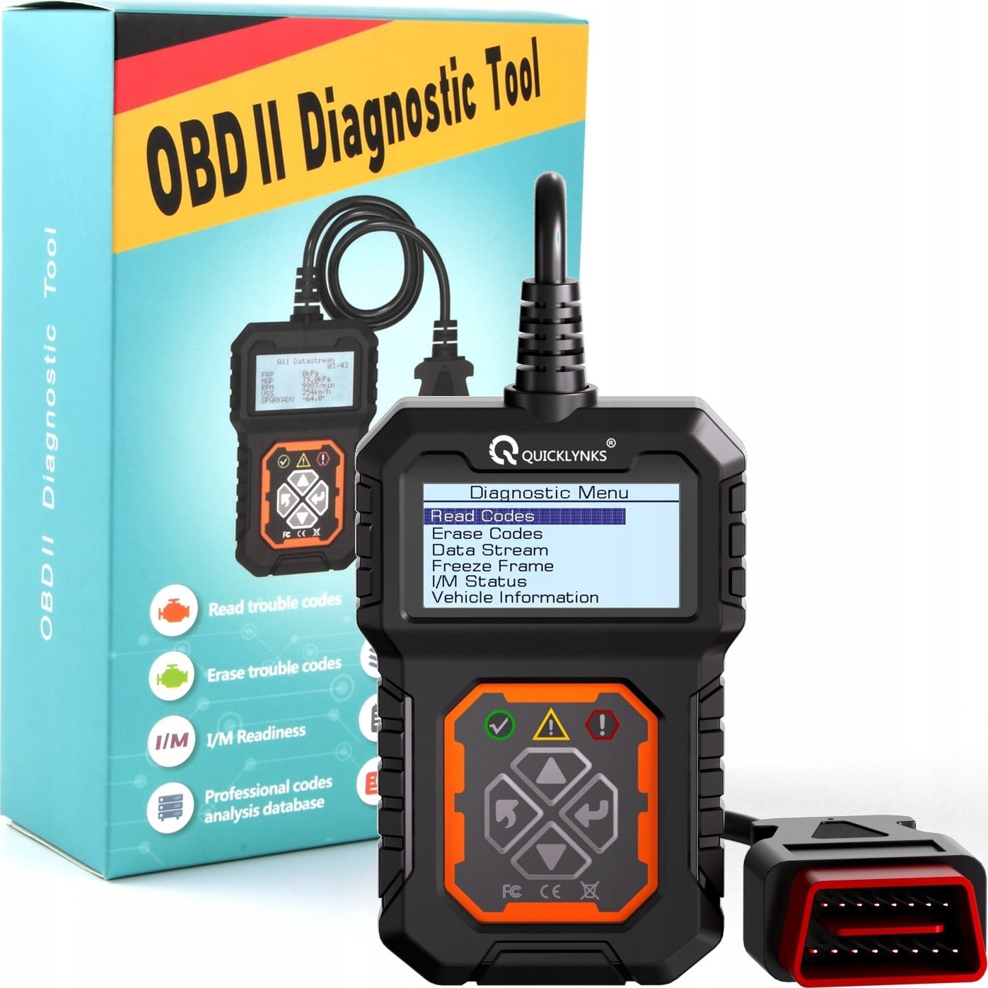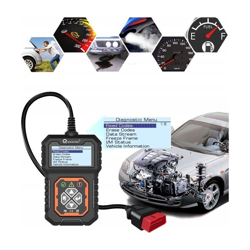 - FEHLERCODES AUSLESEN – Liest DTC-Fehlercodes im Motor und im Getriebe des Fahrzeugs aus und zeigt eine kurze Beschreibung auf dem LCD-Bildschirm an