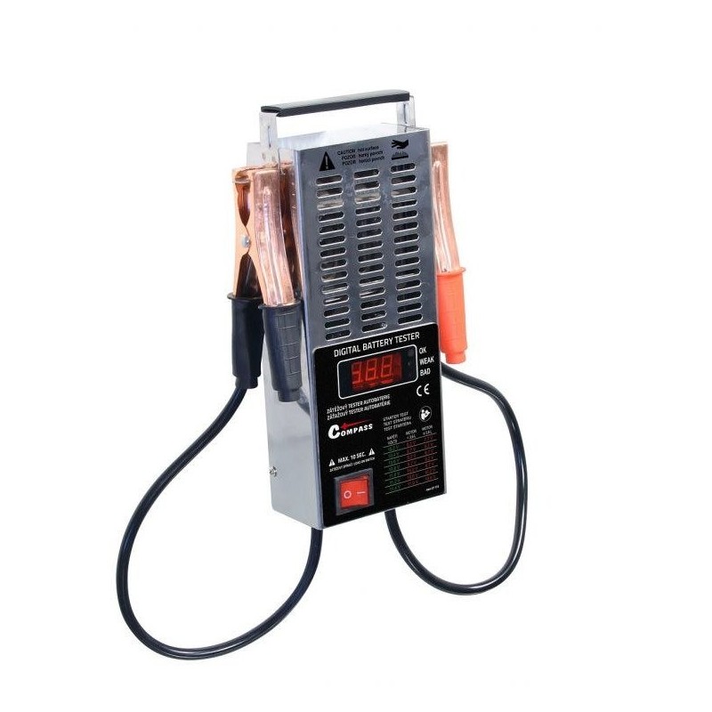 Lasttester zur genauen Überprüfung des Zustands einer Autobatterie. Dieser Tester benötigt keine externe Stromquelle (er wird direkt von der zu messenden Batterie gespeist), wodurch er sehr einfach und mobil einsetzbar ist. Er ist mit einem Lastkreis, zwei Anschlüssen zum Anschluss an die Batterie sowie einem Display zur Anzeige des Messergebnisses ausgestattet.