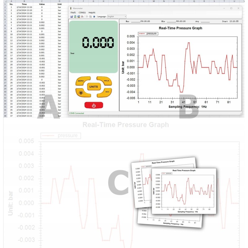 Das Manometer ist mit einer USB-Kommunikationsfunktion ausgestattet, wodurch es an einen Computer angeschlossen werden kann. Die spezielle Software für Windows ermöglicht das Auslesen von Daten in Echtzeit sowie deren Export, was die Erstellung technischer Dokumentationen und die Analyse der Ergebnisse erleichtert.