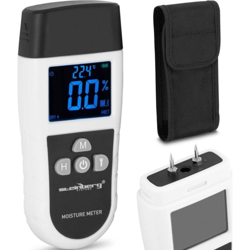 Das 2-in-1-Feuchtigkeitsmessgerät von Steinberg Systems misst nicht nur die Feuchtigkeit, sondern erfasst auch die Temperatur von Materialien. Es eignet sich u. a. für Holz, verschiedene Platten (Faserplatten, OSB-Platten, Spanplatten, MDF-Platten, Gipskartonplatten), Putz, Beton, Mörtel sowie für Wände, Decken, Teppiche usw. Der große Messbereich ermöglicht die Kontrolle der Feuchtigkeit von 0–85 % und der Temperatur von -20–70 °C. Der Feuchtigkeitsgrad wird mittels eines dreifarbigen Balkendiagramms angezeigt. Das Gerät ist mit einem LED-Display ausgestattet. Integrierte Taschenlampe für Messungen an schwer zugänglichen Stellen. Das Messgerät wird mit 5x LR44-Batterien (1,5 V) betrieben.