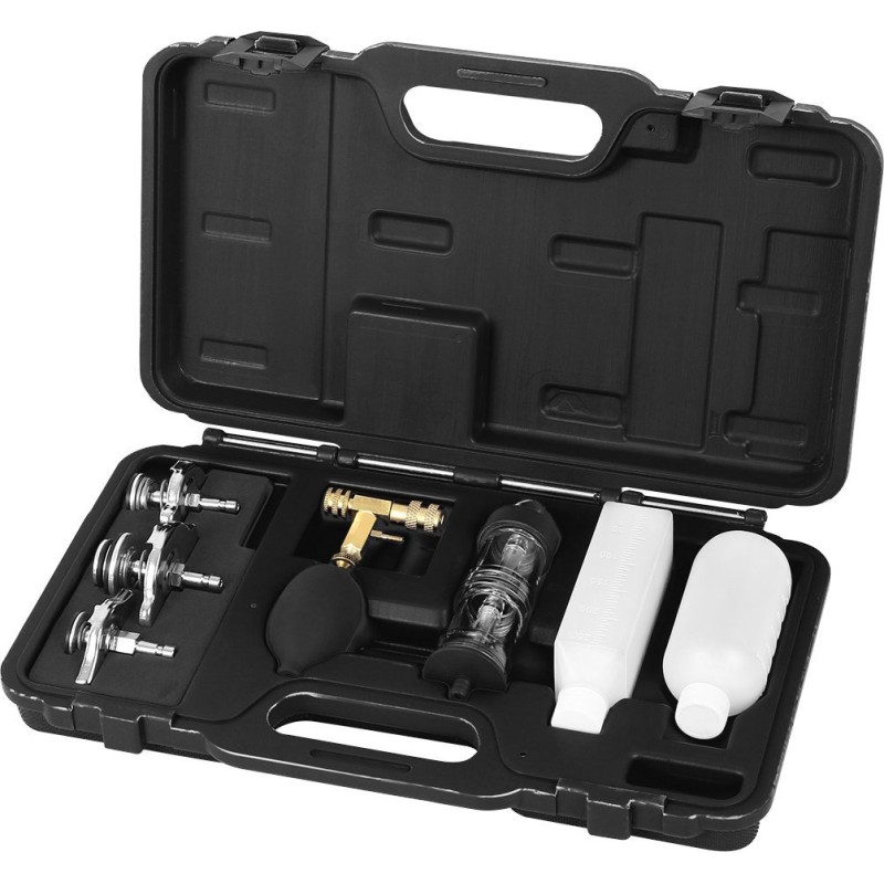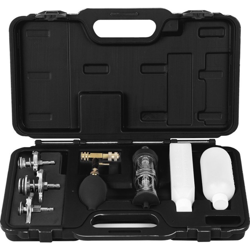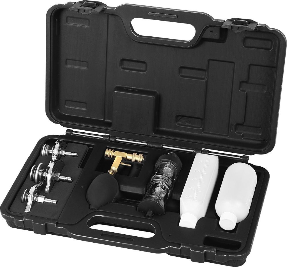 Dichtheitsprüfgerät für die Zylinderkopfdichtung, im Lieferumfang enthalten: Dichtheitsprüfgerät, drei Adapter, Handpumpe zum Absaugen von Gas aus dem Kühlsystem, leerer Behälter für Reaktionsflüssigkeit (250 ml), leerer Behälter für verbrauchte Flüssigkeit (180 ml), Anschluss mit Schnellkupplung, Reaktionsflüssigkeit nicht im Lieferumfang enthalten.