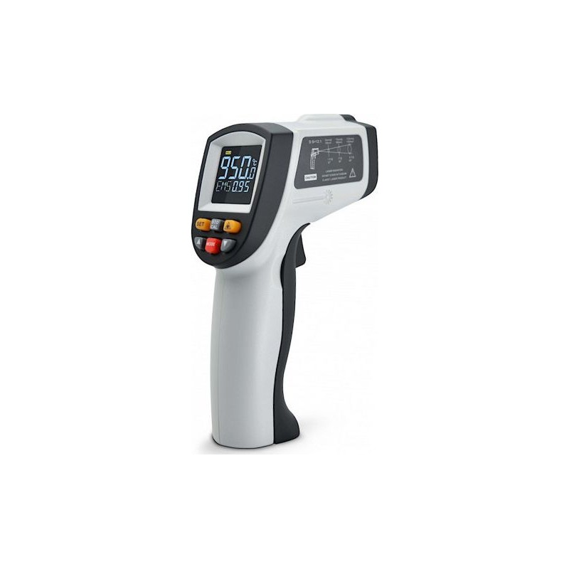 Das Gerät ist mit einem Laservisier ausgestattet, das eine präzise Ausrichtung auf den Messpunkt ermöglicht. Es wurden hochwertige Materialien verwendet, und die ergonomische Bauweise sorgt für einen hohen Bedienkomfort. Das hintergrundbeleuchtete Display ermöglicht den Einsatz des Geräts auch bei Dunkelheit. Das Pyrometer verfügt über eine Abschaltautomatik, wodurch der Batterieverbrauch gesenkt wird.