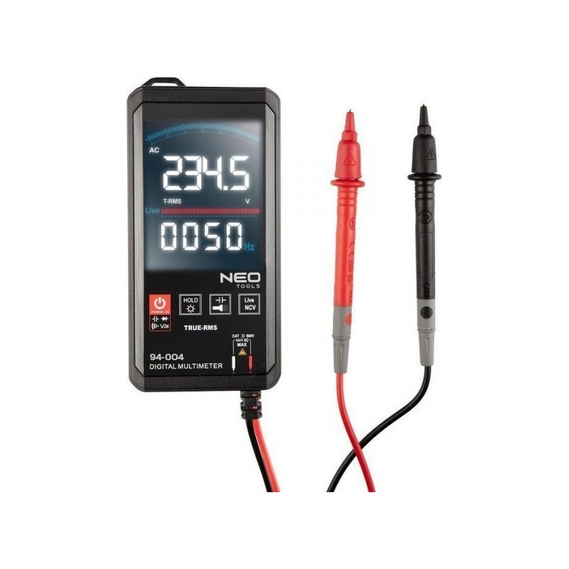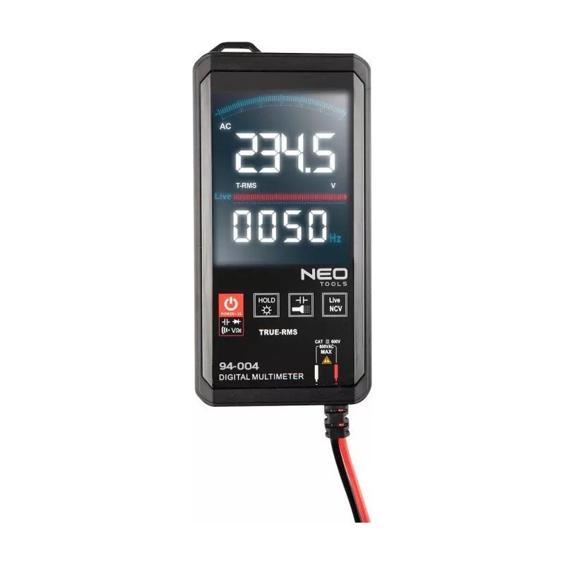 Präzises digitales Farbmessgerät der Marke NEO, bestimmt für spezielle Messungen, die in bestimmten Zeitabständen durchgeführt werden. Es verfügt über ein LCD-Display mit Hintergrundbeleuchtung, das Werte bis zu 5999 anzeigen kann. Zwei integrierte Messsonden sorgen für eine hohe Qualität der Messergebnisse. Das Touchpanel ermöglicht eine komfortable Bedienung des Geräts und die Nutzung seiner vielfältigen Funktionen.