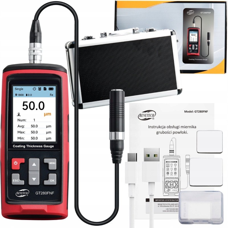 Das Lackdickenmessgerät GT280FNF ist ein modernes Gerät, das Ultraschall zur zerstörungsfreien Messung der Dicke verschiedener Materialien nutzt. Dank der am Kabel befestigten Messsonde ermöglicht es schnelle und genaue Dickenmessungen an Metall, Glas, Kunststoff, Keramik, Aluminium, Kupfer, Gold, Harz, Wasser und Glyzerin. Es ist das ideale Werkzeug für Profis in der Fertigungsindustrie sowie in der Qualitätskontrolle von Waren.
