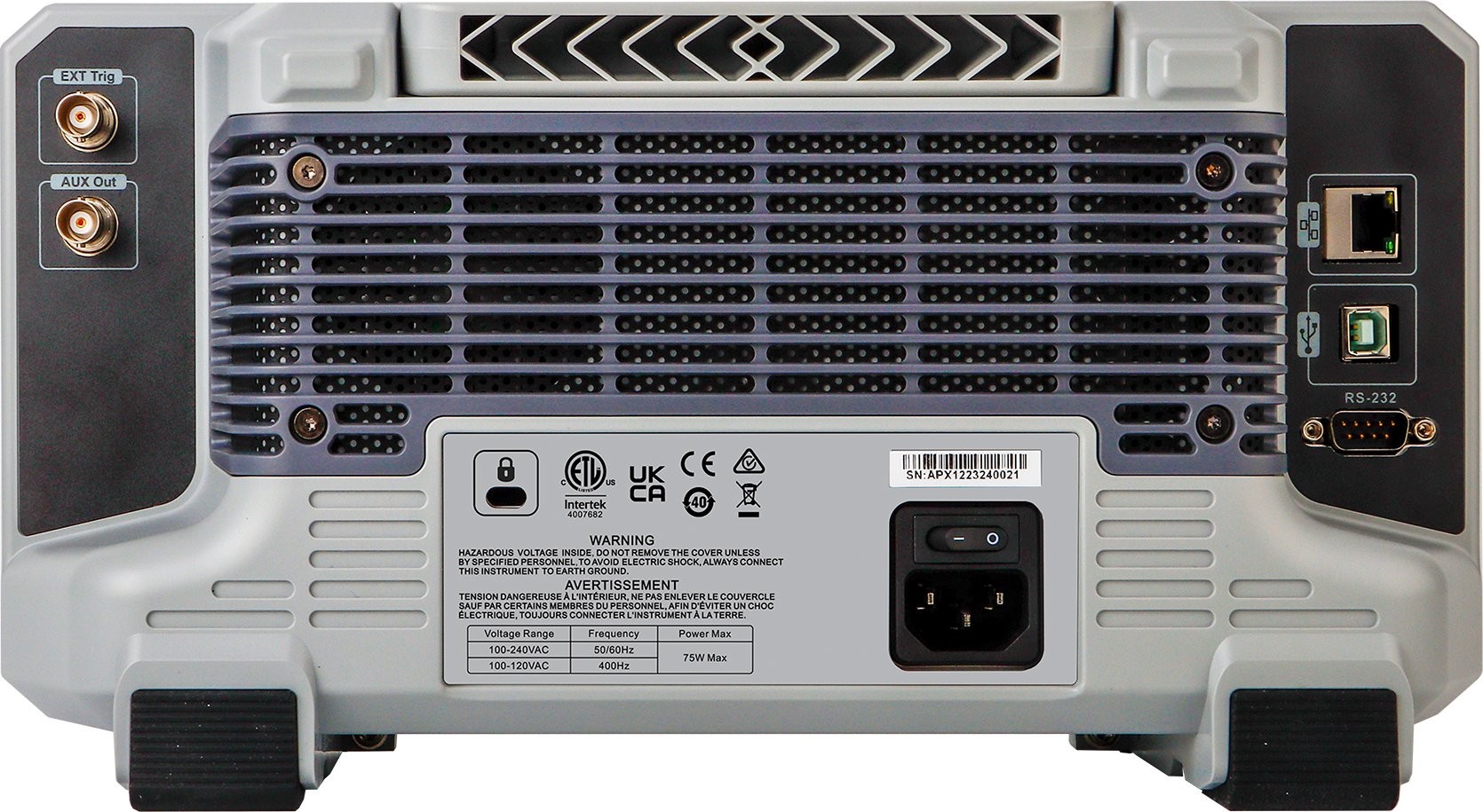 Schnittstellen: USB-Host, USB-Device, LAN, EXT Trig, AUX (Trig Out, Pass/Fail, DVM)