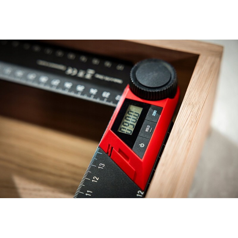 - Die Messkante verfügt zudem über einen Kantenanschlag, sodass das WMD als digitales Messquadrat verwendet werden kann. Der Hauptarm wird an der Kante befestigt, und mit dem zweiten Arm wird der Winkel gemessen oder markiert. Die Begrenzungskante sorgt für einen sicheren Halt und verhindert ein versehentliches Verrutschen des Werkstücks während der Messung.