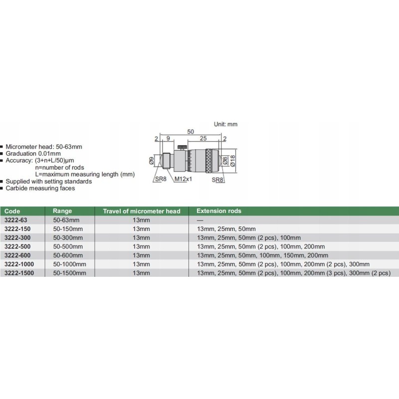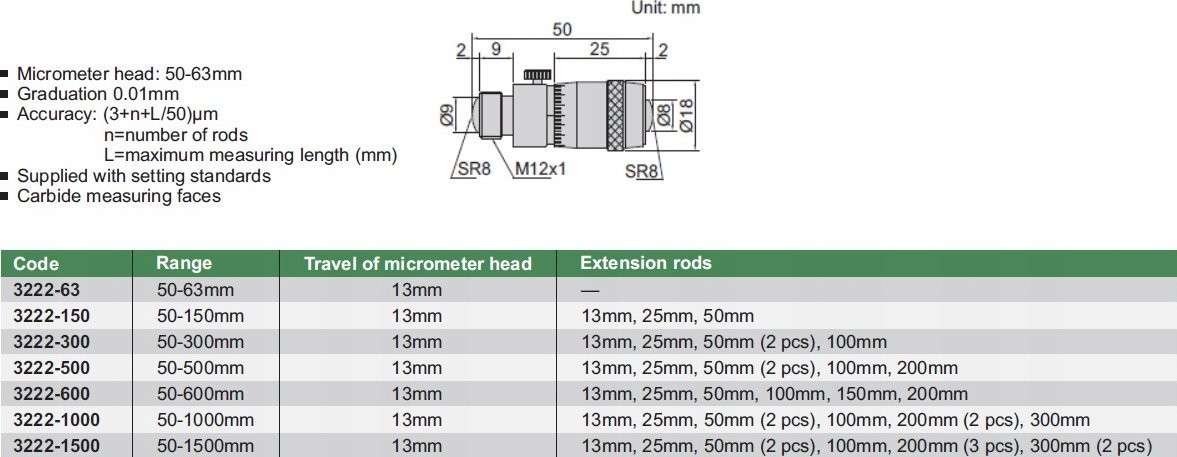 - Genauigkeit: (3+n+L/50) µm; n – Anzahl der Verlängerungen, L – maximale Messlänge (mm)