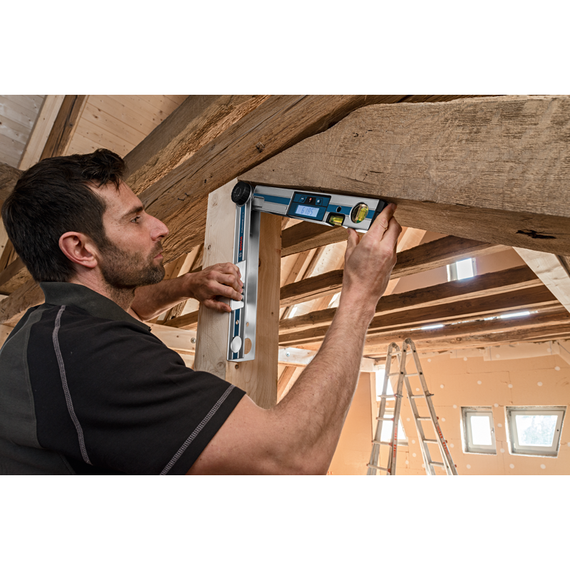 Der größte Vorteil des digitalen Winkelmessers von Bosch ist natürlich seine Messgenauigkeit beim Winkel, die bei +- 0,1° liegt, die Messgenauigkeit bei der Wasserwaage beträgt +-0,05° und die Genauigkeit bei der Winkelberechnung liegt bei +- 0,1°. Zur Standardausstattung dieses Modells gehören eine Verlängerung für den Messarm, die die Vermessung großer Bauteile ermöglicht, sowie eine Transporttasche, die den Transport des Messgeräts erleichtert.