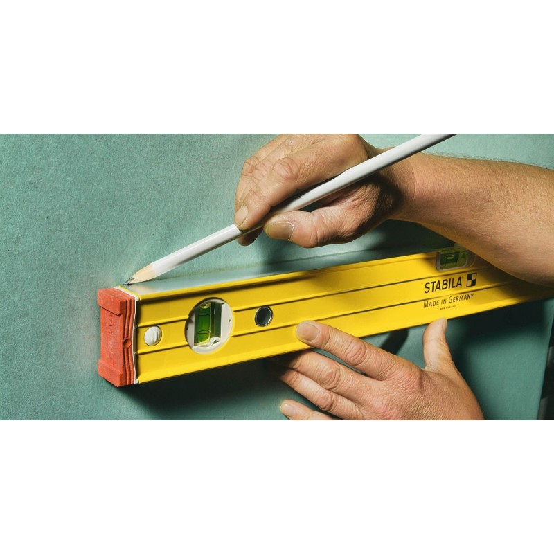 Auf der Baustelle wird die Wasserwaage stark beansprucht, und es kann oft vorkommen, dass sie herunterfällt. Umso wichtiger ist es, dass sie auch bei täglicher Beanspruchung noch genauso genau misst wie am ersten Tag. Zwei vertikale Libellen ermöglichen das Ablesen in jeder Position. Das robuste, verstärkte Aluminium-Rechteckprofil und die STABILA-Montagetechnologie mit fest vergossener Libelle machen dieses Gerät zum perfekten Partner für anspruchsvolle Bauaufgaben. Wasserwaagen von STABILA: Präzision ein Leben lang.