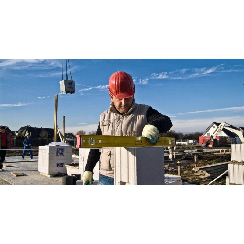 Auf der Baustelle wird die Wasserwaage stark beansprucht, und es kann oft vorkommen, dass sie herunterfällt. Umso wichtiger ist es, dass sie auch bei täglicher Beanspruchung noch genauso genau misst wie am ersten Tag. Zwei vertikale Libellen ermöglichen das Ablesen in jeder Position. Das robuste, verstärkte Aluminium-Rechteckprofil und die STABILA-Montagetechnologie mit fest vergossener Libelle machen dieses Gerät zum perfekten Partner für anspruchsvolle Bauaufgaben. Wasserwaagen von STABILA: Präzision ein Leben lang.