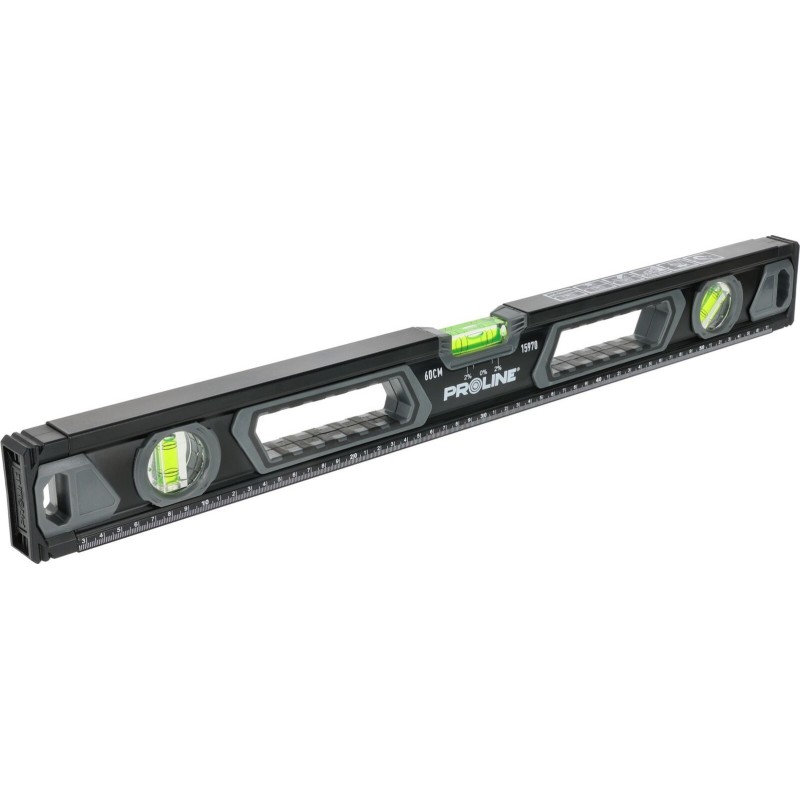 Die Wasserwaage mit Griffen PREMIUM Proline 15974 (150 cm) und drei Libellen ist ein Werkzeug aus hochwertigem Aluminium, das Langlebigkeit und Messpräzision gewährleistet. Dank des rechteckigen Aluminiumprofils mit zusätzlichen Sicken zeichnet sich die Wasserwaage durch Robustheit sowie einen ergonomischen, sicheren Griff aus.