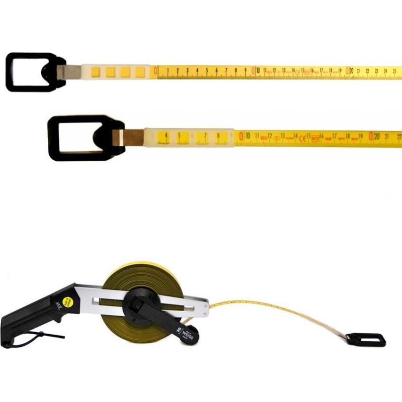 STEWE-LON-Stahlband der deutschen Firma WEISS auf einem schrägen Aluminiumrahmen, beschichtet mit einer dickeren Schicht aus pulverbeschichtetem Polyamid. Ausgestattet mit einem ergonomischen Griff aus hochwertigem Kunststoff, der sicher in der Hand liegt, sowie einer praktischen Aufrollvorrichtung, die hohen Arbeitskomfort gewährleistet. VORTEILE DES WEISS-RAHMENS Geringes Gewicht Torsionssteife Konstruktion Ergonomisch geformter Griff Der tangentiale Bandauslauf schützt das Band vor Verformung Die Metallachse des Kurbelkerns sorgt für einen lang anhaltend reibungslosen Betrieb beim Ab- und Aufwickeln des Bandes Die Konstruktion der Kurbel schützt die Fingerspitzen vor Verletzungen Technische Daten Länge: 30 m Material: Stahl mit Polyamidbeschichtung Bandbreite: 13 mm Teilung: Millimeter Bandfarbe: gelb Skalenfarbe: schwarz, Zahlen auf dem ganzen Meter rot Klasse: II (Fehlertoleranz +/- 6,3 mm bei 20 °C, horizontaler Ausrichtung und einer Zugkraft von 50 N) Linearer Wärmeausdehnungskoeffizient: 11,5 × 10^-6 Zugfestigkeit: ca. 2 1700 N/mm^2 Fragen Sie nach größeren Mengen unter Tel. 56 306 61 00