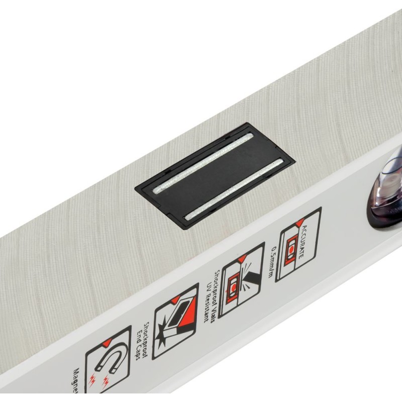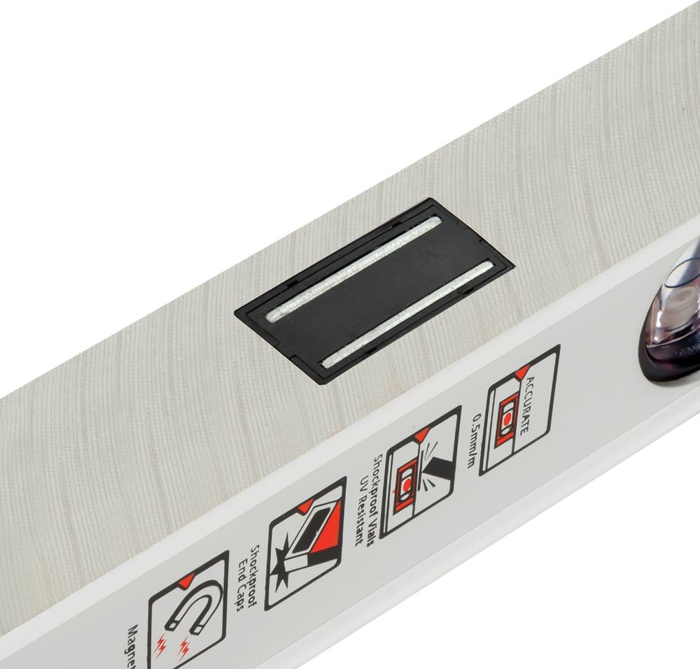 - Verstärktes Profil mit Steg im horizontalen Libellenkörper für erhöhte Festigkeit und dauerhafte Kantenmarkierung