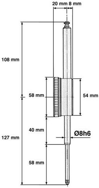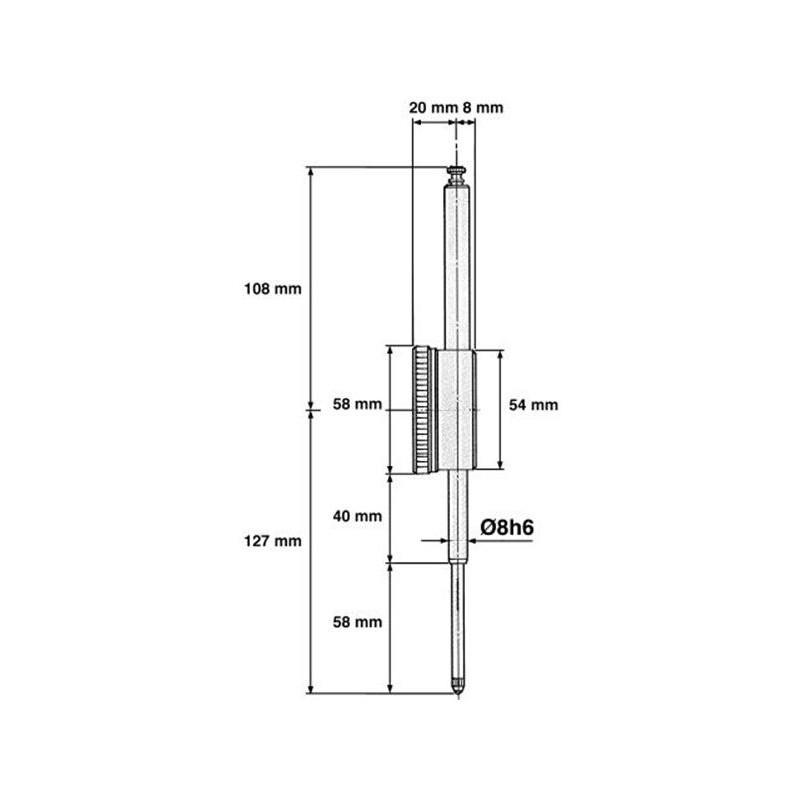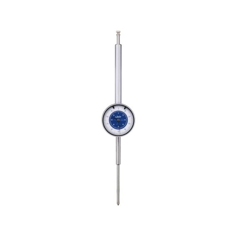 Drehbare Skalenscheibe mit zwei einstellbaren Toleranzfeldzeigern. Zusätzlicher Zeiger für volle Millimeter. Gehäuse aus Aluminium. Austauschbare Messspitze. Ohne Befestigungsöse.