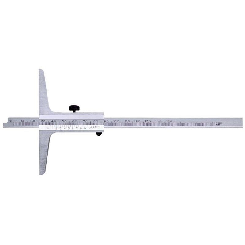 Aus Edelstahl. Mattverchromte Skala. Die Enden des Maßstabs und der Querstrebe sind gehärtet. Skala in mm mit 1/20-mm-Nonius. Mit Feststellklemme. Toleranz nach DIN 862
