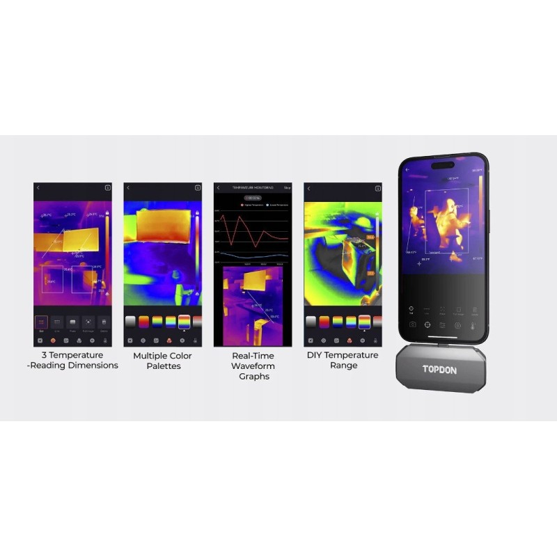 Die TC002C ist mit der TopInfrared-App kompatibel, die eine Reihe fortschrittlicher Funktionen bietet. Benutzer können verschiedene Temperaturmessmodi (Punkt, Linie, Fläche) auswählen, Temperaturgrenzwerte anpassen und Temperaturänderungen in Echtzeit visualisieren. Dies macht die Datenanalyse noch einfacher und intuitiver.