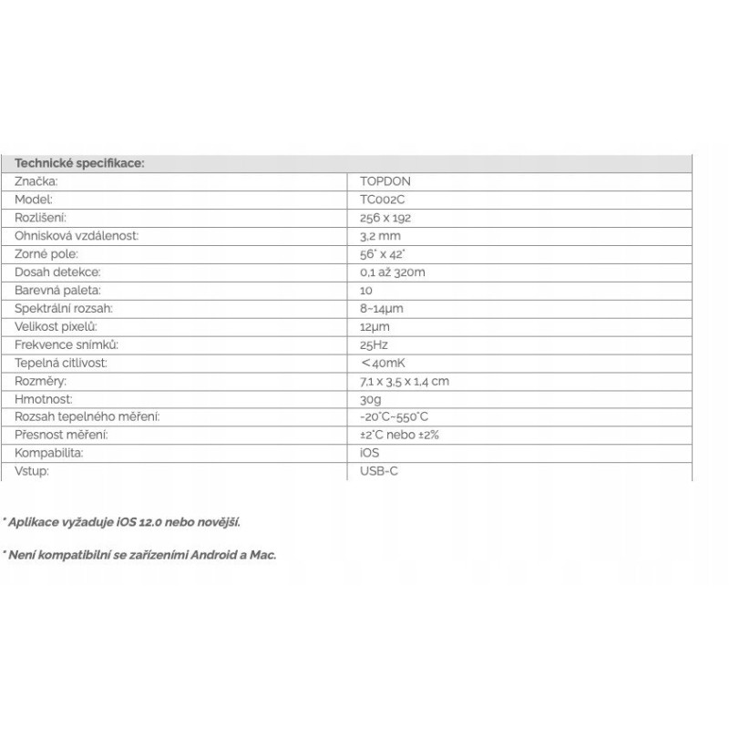 Technische Daten der Wärmebildkamera TOPDON TC002C