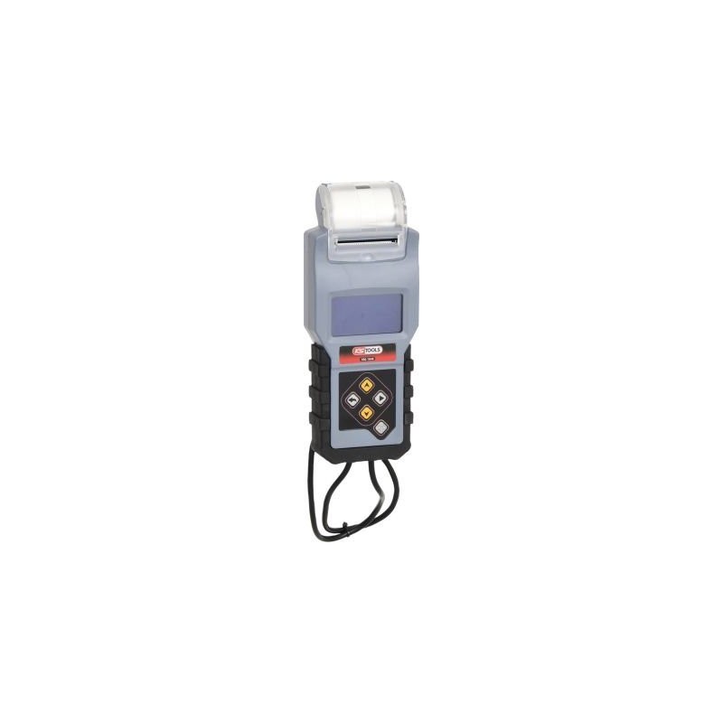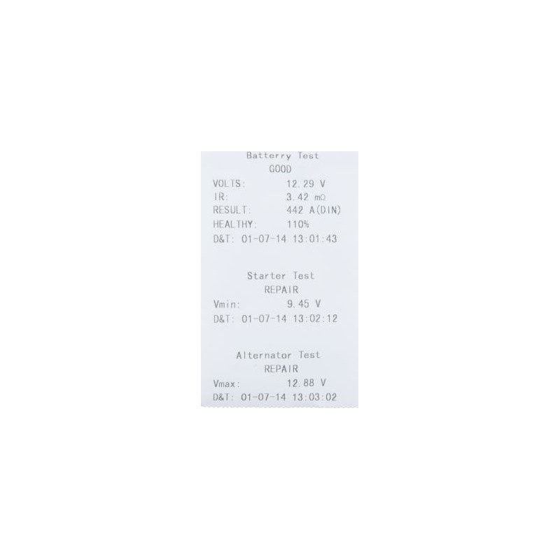 12-V-Batterie- und Ladesystemtester mit integriertem Drucker • zur Prüfung von 12-V-Batterien (einschließlich Blei-, Gel-, Sanitär-, MF-, VRLA-, Kalzium-, AGM- und Tiefentladungsbatterien) •Einfache Bedienung über ein Navigationsmenü • Ausgestattet mit einem Thermodrucker • Automatische Steuerung des gesamten Testvorgangs über das Navigationsmenü • Schnelle und einfache Bestimmung der Batterieleistung unter Berücksichtigung der Temperaturkompensation • Prüft den Zustand der Batterie, den Ladezustand, den Innenwiderstand sowie die aktuelle Spannung beim Kaltstart •Die Batterieprüfung erfolgt schnell und präzise, das Ergebnis wird in einem Protokoll ausgedruckt•Ermöglicht die Prüfung der Starterbatterie, des Anlassers und des Batterieladesystems•Das Protokoll mit den Testergebnissen dient als Unterstützung für die Werkstattkunden•Anschluss an die Batterie über kunststoffbeschichtete Polklemmen mit Krokodilklemmen•Es ist darauf zu achten, dass die Batterie nicht zu lange durch Messungen belastet wird•Digitalanzeige mit Hintergrundbeleuchtung für eine einfache Ablesbarkeit der Ergebnisse•Ein 0,43 m langes Kabel sorgt für Flexibilität bei der Arbeit•Eine Rolle Thermopapier ist im Lieferumfang enthalten•Das robuste Gummi-Gehäuse sorgt für Dichtheit