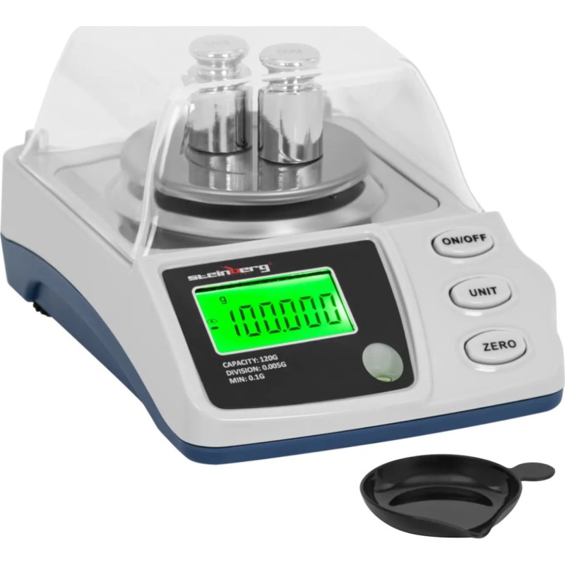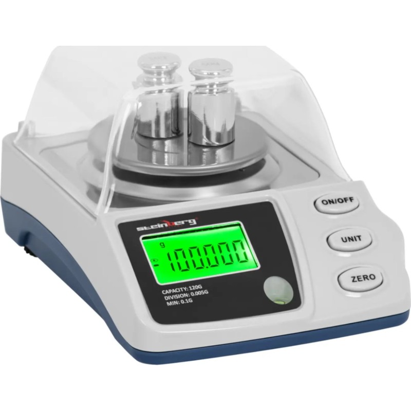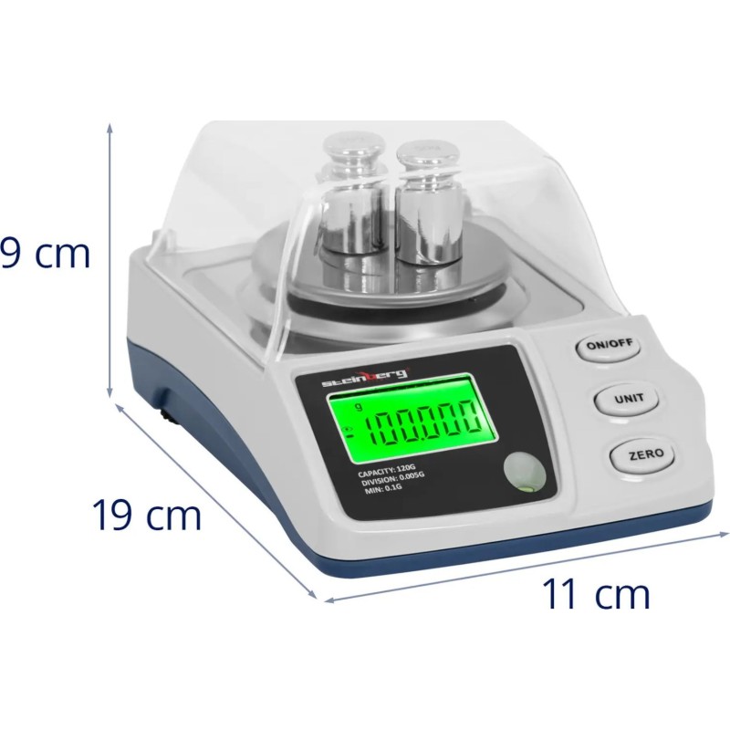 Die professionelle Waage erfasst jedes Gewicht bis 120 g mit einer hohen Genauigkeit von 0,005 g. Das Display zeigt die Ergebnisse schnell in Schritten von 0,002 g an. Je nach Bedarf stehen dir verschiedene Maßeinheiten zur Verfügung: g, mg, ct, oz, ozt, dwt und gn. Darüber hinaus bietet Ihnen die Präzisionswaage einen breiten Funktionsumfang, darunter Nullstellen, Selbstkalibrierung und Tarieren sowie eine automatische Abschaltfunktion. Dank der bis zu 9 mm höhenverstellbaren Füße und der integrierten Wasserwaage können Sie das Gerät präzise ausrichten, um genaue Ergebnisse zu erzielen. Die abnehmbare Abdeckung sorgt wiederum für zusätzlichen Schutz empfindlicher Gegenstände.