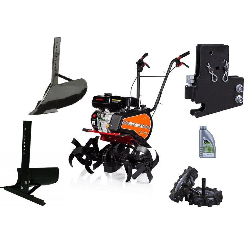 Motortyp: Verbrennungsmotor, Viertakt, obenliegende Ventile. Motorhersteller: LONCIN. Motormodell: G200F. Hubraum: 196 cm³. Maximale Motorleistung: 6,5 PS. Maximale Arbeitsbreite: 84 cm. Maximale Arbeitstiefe: 33 cm. Anzahl der Arbeitssterne: 6 (3+3). Anzahl der Mähmesser: 24. Vorwärtsgang: ja. Rückwärtsgang: ja. Seitliche Pflanzenschutzscheiben: nein. Anzahl der Stützräder: 2 hinten. Optionales Zubehör: Gummi- und Metallräder, Konsole, Pflug, Streuer, Ausgraber, Pflugschar, Vertikutierer, Seitenscheiben.