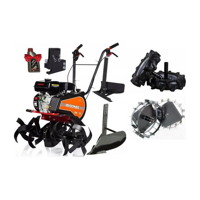 Motortyp: Verbrennungsmotor, Viertakt, obenliegende Ventile. Motorhersteller: LONCIN. Motormodell: G200F. Hubraum: 196 cm³. Maximale Motorleistung: 6,5 PS. Maximale Arbeitsbreite: 84 cm. Maximale Arbeitstiefe: 33 cm. Anzahl der Arbeitssterne: 6 (3+3). Anzahl der Mähmesser: 24. Vorwärtsgang: ja. Rückwärtsgang: ja. Seitliche Pflanzenschutzscheiben: nein. Anzahl der Stützräder: 2 hinten. Lieferumfang: Gummiräder, Metallräder, Anbaubügel (Anhängevorrichtung), Streuschale, Pflug, Motoröl.