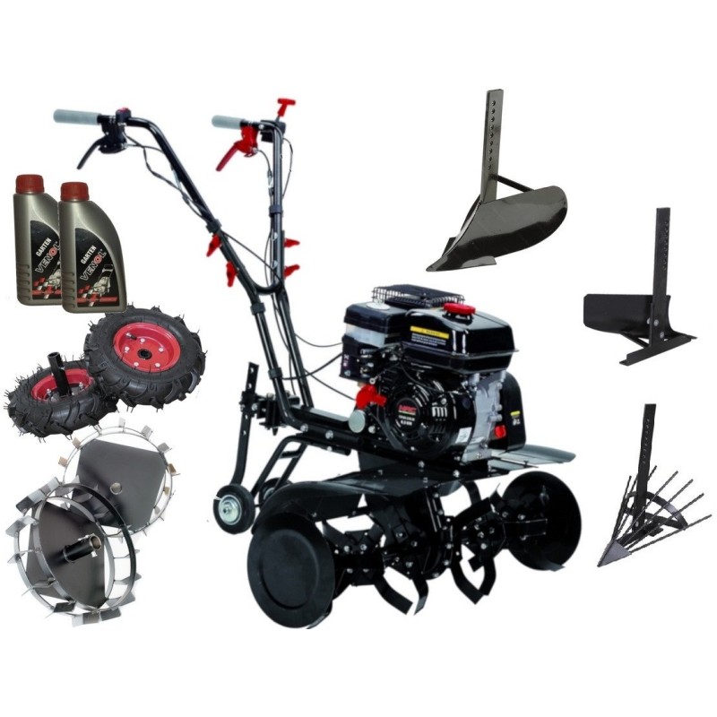 Im Lieferumfang des Bodenfräsers ist ein 8-teiliges Zubehörset enthalten, das nicht nur Metall- und Gummiräder, sondern auch einen Kartoffelroder, einen Beetstreuer und einen Einschar-Pflug umfasst. Darüber hinaus sind im Set die notwendigen Montagewerkzeuge sowie zwei Motoröle enthalten, sodass Sie sofort nach dem Kauf einsatzbereit sind.