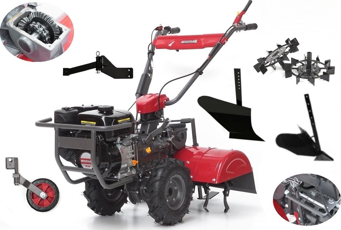 Motortyp: Verbrennungsmotor, Viertakt, obenliegende Ventile. Motorhersteller: HORTMASZ. Hubraum: 212 cm³. Maximale Motorleistung: 6,5 PS. Maximale Arbeitsbreite: 62 cm. Anzahl der Arbeitsmesser: 4 (2+2). Anzahl der Mähmesser: 18. Drehrichtung der Messer: gemischt – die äußeren Messer drehen sich entgegen der Drehrichtung der inneren. Vorwärtsgang: ja, 2 Gänge. Rückwärtsgang: ja. Seitliche Pflanzenschutzscheiben: nein. Anzahl der Stützräder: 2 große Antriebsräder vorne.