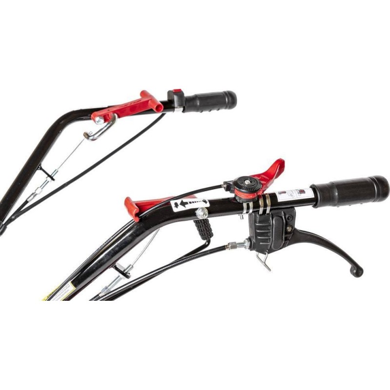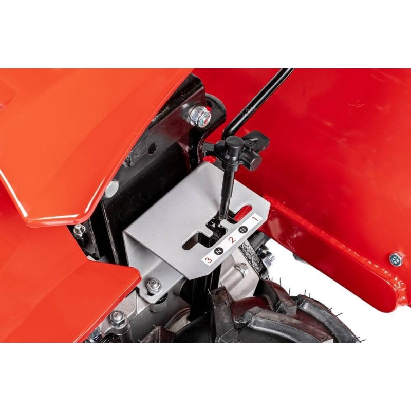 Der Motorhacke verfügt über Transporträder, die das Bewegen erleichtern, sowie über eine höhenverstellbare Steuerhebel, mit der die Höhe an die Körpergröße des Benutzers angepasst werden kann.