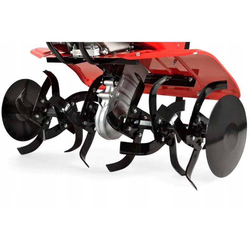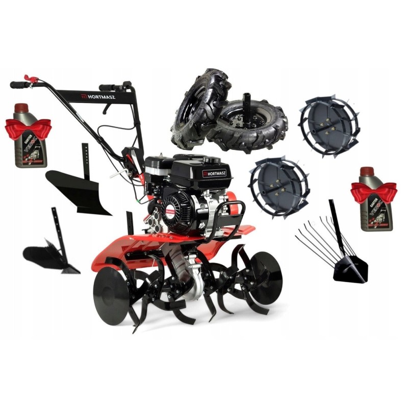 Im Lieferumfang des Motorhackers ist ein 9-teiliges Zubehörset enthalten, das dessen Funktionalität erweitert. Zu den Zubehörteilen gehören Gummi- und Metallräder, ein Kartoffelroder, ein Einschar-Pflug, ein Streuer sowie seitliche Stahlscheiben, die die Pflanzen vor Beschädigungen schützen.