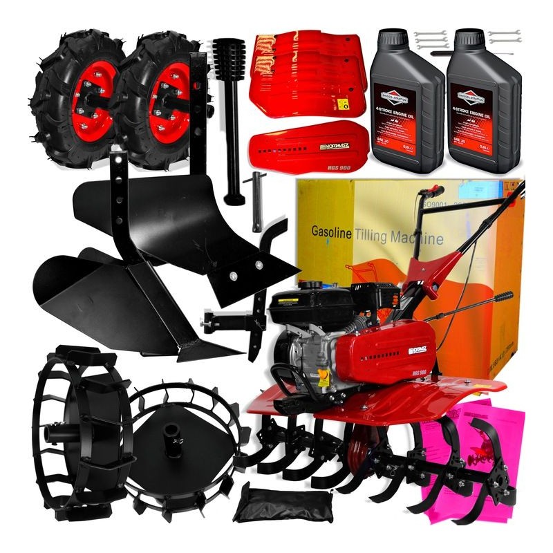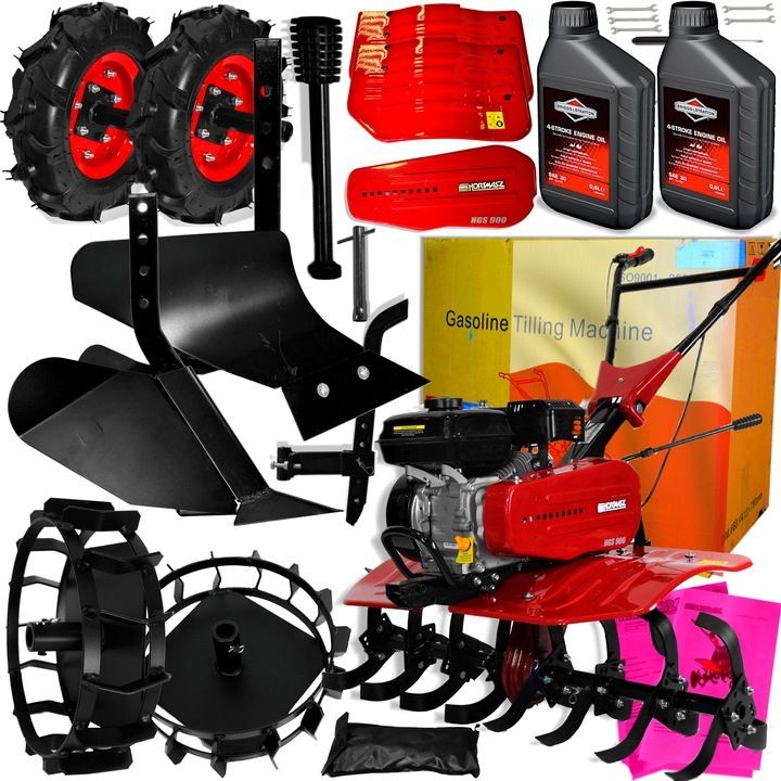 Motortyp: Verbrennungsmotor, Viertakt, obenliegende Ventile. Motorhersteller: HORTMASZ. Motormodell: 212. Hubraum: 212 cm³. Maximale Motorleistung: 7,0 PS. Maximale Arbeitsbreite: 100 cm. Maximale Arbeitstiefe: 30 cm. Anzahl der Arbeitssterne: 8 (4+4). Anzahl der Jätmesser: 24. Vorwärtsgang: ja, 2 Gänge. Rückwärtsgang: ja. Seitliche Pflanzenschutzscheiben: nein. Anzahl der Stützräder: nein. Im Lieferumfang enthalten: Gummiräder. Optionales Zubehör: Metallräder, vorderes Stützrad, Pflug, Streuer, Ausreißer.