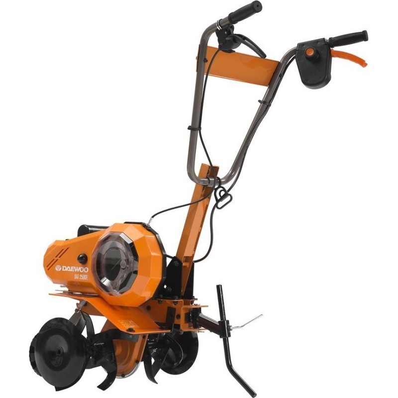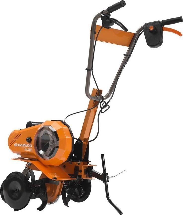 Der Motorhacke DAT 2500E ist mit einem elektrischen Induktionsmotor und geschmiedeten, gebogenen Messern ausgestattet, wodurch sie selbst mit schwerem Boden zurechtkommt. Das Gerät verfügt über ein zerlegbares Kettengetriebe, das bis zu 100 % des Drehmoments des Motors auf die Messer überträgt. Das Transportrad ermöglicht einen einfachen Transport des Geräts zwischen den Arbeitsbereichen. Die elektrische Motorhacke der Marke Daewoo ist für die Bodenlockerung und das Ausbringen von Dünger in Hausgärten vorgesehen. Der elektrische Motorhacke DAT 2000E zeichnet sich durch hohe Arbeitsleistung aus. Dank des Elektromotors ist das Gerät leicht und funktional; die kompakte Bauweise macht die Handhabung einfach und erfordert keinen großen Kraftaufwand seitens des Benutzers. Geräte der Marke DAEWOO stehen für Anwender auf der ganzen Welt für komfortables und sicheres Arbeiten zu Hause, im Garten, in der Garage oder in der Werkstatt. Das Erfolgsgeheimnis der Marke liegt in ihrem kompromisslosen Anspruch an Qualität und technisches Niveau der Produkte sowie in ihrem Bestreben, die Bedürfnisse, Wünsche und Erwartungen der Kunden in jedem Winkel der Welt zu erfüllen. Mit der Wahl von DAEWOO-Produkten schließen Sie sich einer millionenstarken Verbrauchergemeinschaft der neuen Generation an, die auf rationale Entscheidungen setzt, ihre Zeit und ihr Geld schätzt und den neuesten Trends in Technologie und Design folgt. Der elektrische Motorhacke DAT 2500E der Marke DAEWOO ist ein Gerät mit hoher Leistung. Die Arbeitsbreite der Maschine beträgt 55 cm. Der Motorhacke ist ein unersetzliches Gerät zum Umgraben, Auflockern und Einebnen des Bodens. Er eignet sich sowohl für große als auch für kleine Gärten. Die Arbeitsweise dieses Geräts besteht darin, Erdstücke abzuschneiden und nach hinten auszuwerfen. Damit bereiten wir den Boden für die Rasensaat vor oder mischen Dünger mit dem Boden. Das Gerät verfügt über einen 2000-W-Elektromotor, wodurch der Motorhacke reibungslos und leistungsstark arbeitet. Die maximale Arbeitstiefe beträgt 24 cm. Außerdem verfügt das Gerät über Annehmlichkeiten wie einen bequemen Griff mit weicher Ummantelung sowie eine einfache Hebe- und Senkfunktion der Räder für den Transport des Motorhackers.