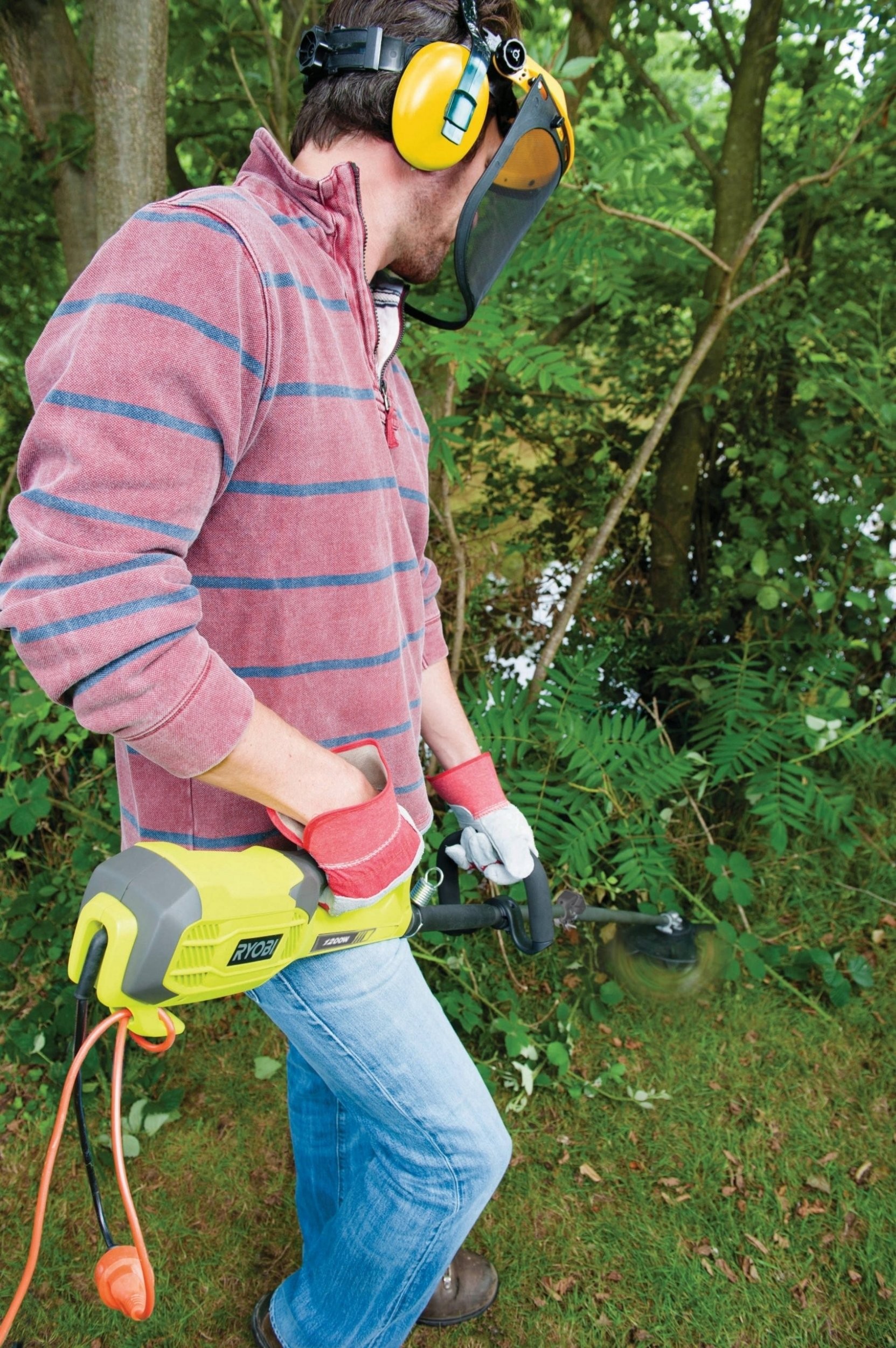 - Die elektrische Motorsense von Ryobi ist mit einem Zusatzgriff für komfortables Halten während der Arbeit ausgestattet