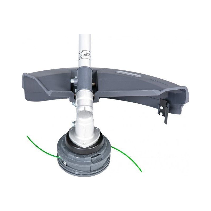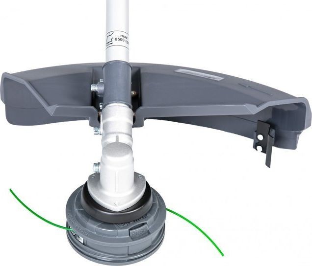 - Der Schneidkopf ist eine neue Version des bewährten „Tap & Go“-Fadenschneidkopfes, ausgestattet mit einem 2,4 mm starken Nylonfaden, dessen Länge durch Aufschlagen des rotierenden Kopfes auf den Boden während des Grasmähens leicht verlängert werden kann, was einen unterbrechungsfreien Betrieb ermöglicht.
