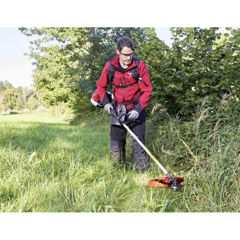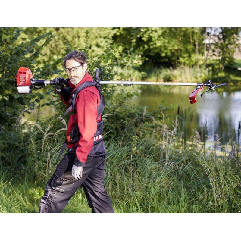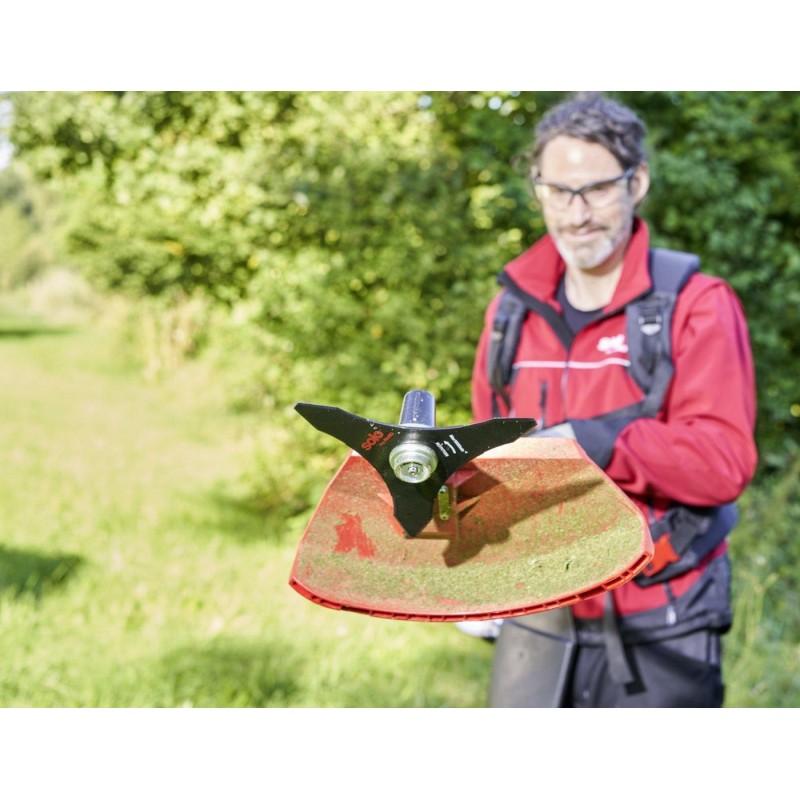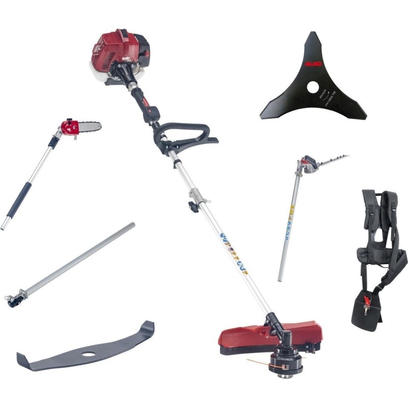 Motortyp: Verbrennungsmotor, Zweitakter. Motorhersteller: AL-KO. Hubraum: 30 cm³. Nennleistung: 0,9 kW. Kraftstoffgemisch (Benzin:Öl): 40:1. Schnittbreite mit Fadenschneidkopf: 410 mm. Kopfart: Doppelfaden. Schnittbreite mit Schneidscheibe: 250 mm. Scheibentyp: Dreizahn. Länge des Schneidmessers: 600 mm. Länge der Führungsschiene: 250 mm. Griff: Schlaufengriff. Vibrationsdämpfender Griff: ja. Führungsrohr: geteilt. Arbeitsgurt: professioneller Gurt.