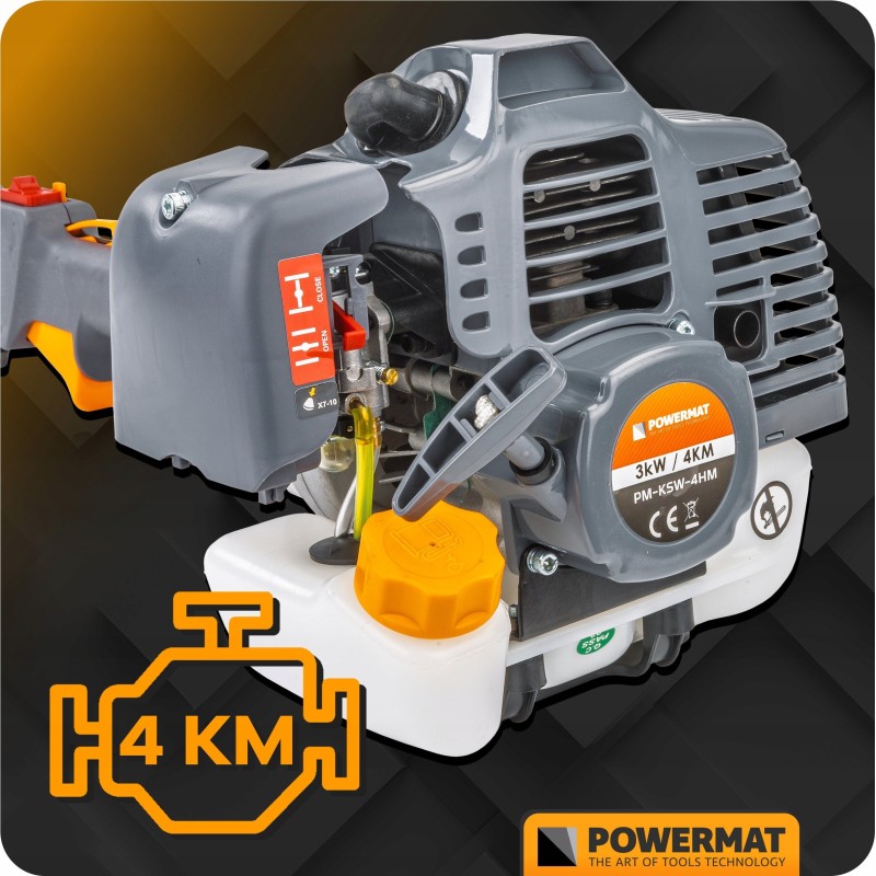 Die Powermat-Motorsense ist mit einem 42-cm³-Motor mit 4 PS ausgestattet, der für hohe Effizienz und Laufruhe sorgt, selbst unter schwierigen Bedingungen. Dank des Zweitaktmotors arbeitet das Gerät reibungslos und störungsfrei, sodass alle Gartenarbeiten schnell erledigt werden können.