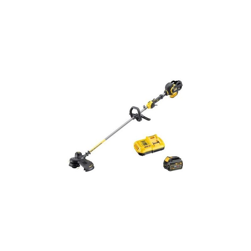 Akku-Rasentrimmer mit 2 Geschwindigkeitsstufen aus der neuen FlexVolt 54V-Serie von DeWalt [DCM571X1], ausgestattet mit 1 Li-Ion-Akku DCB547 mit einer Kapazität von 9,0 Ah und einer Betriebsspannung von 54 V sowie einem Schnellladegerät DCB118. Das Ganze wird in einem Karton geliefert;