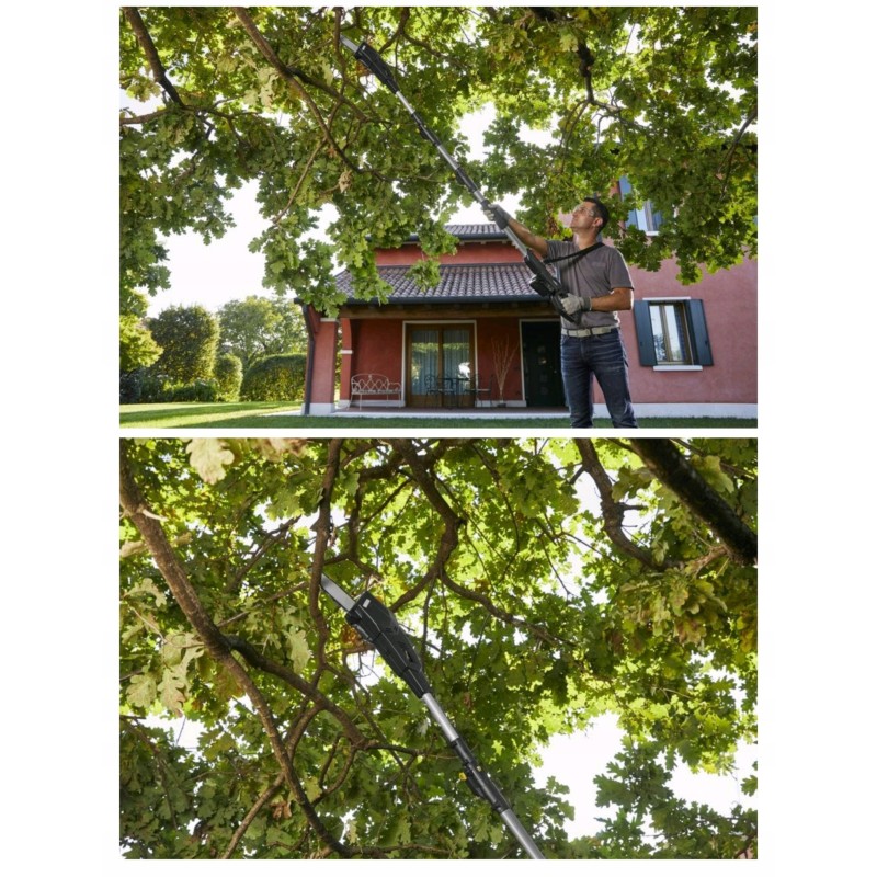 Der integrierte Teleskopstiel ermöglicht eine maximale Reichweite von bis zu 4 Metern, wodurch Arbeiten in der Höhe jetzt einfacher und sicherer sind. Der Benutzer kann Äste bequem beschneiden, ohne auf eine Leiter steigen zu müssen.