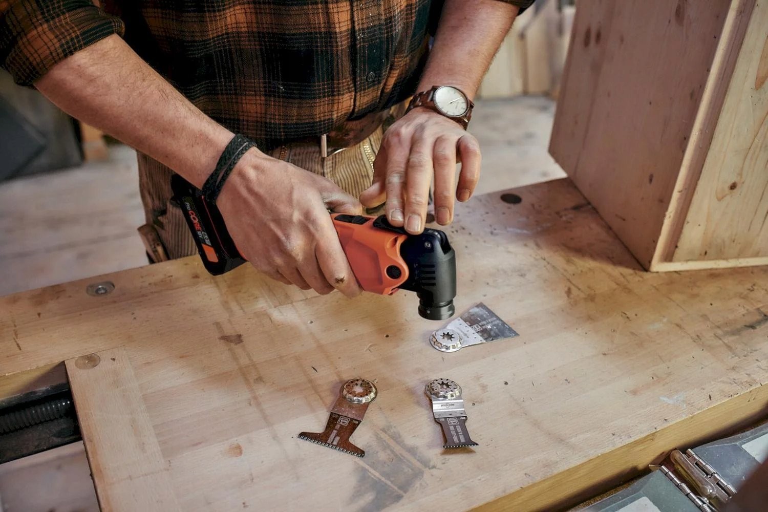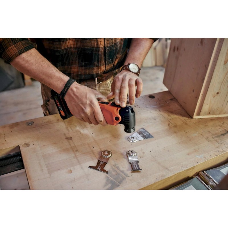 Leistungsstarkes Akku-Multitool für schnellen Arbeitsfortschritt bei Bau- und Renovierungsarbeiten mit über 30 Zubehörteilen – zum Sägen in Holz und Metall, Schleifen, Fliesenschneiden und für weitere Aufgaben.