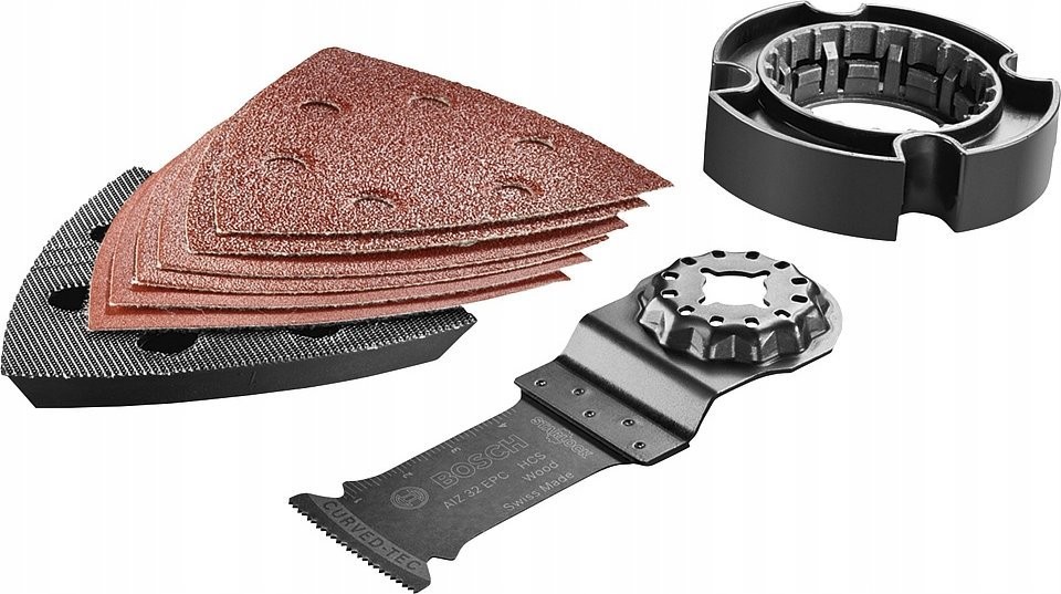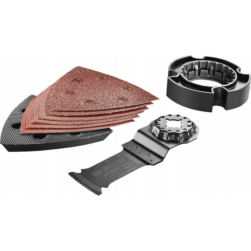 Das Modell UniversalMulti 12 Solo verfügt über einen Starlock-Aufnahme, an dem alle Werkzeuge der innovativen Starlock-Zubehörserie von Bosch befestigt werden können. Im Lieferumfang des Multifunktionswerkzeugs ist ein Set mit verschiedenen Zubehörteilen enthalten: