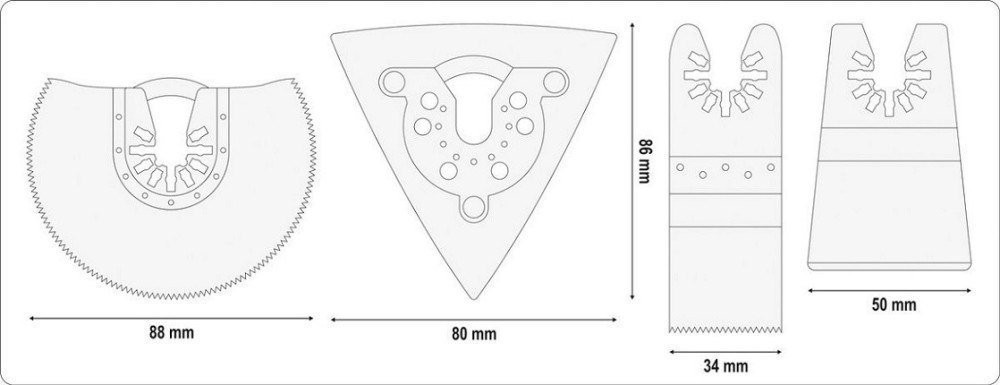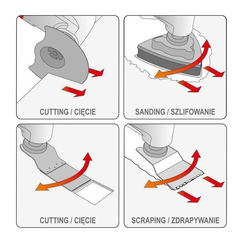 - Ermöglicht das Schneiden von Möbelplatten, das Unterschneiden von Türen und das Durchtrennen von Paneelen sowie Sockelleisten ohne Beschädigung des Laminats sowie von Metallelementen (Nägel, Schrauben).
