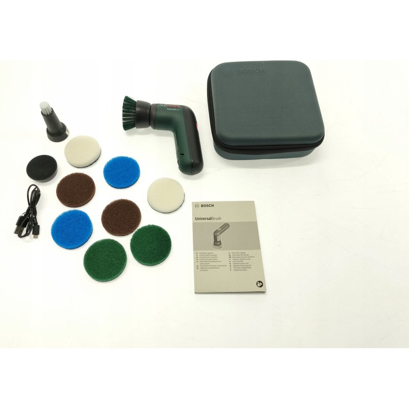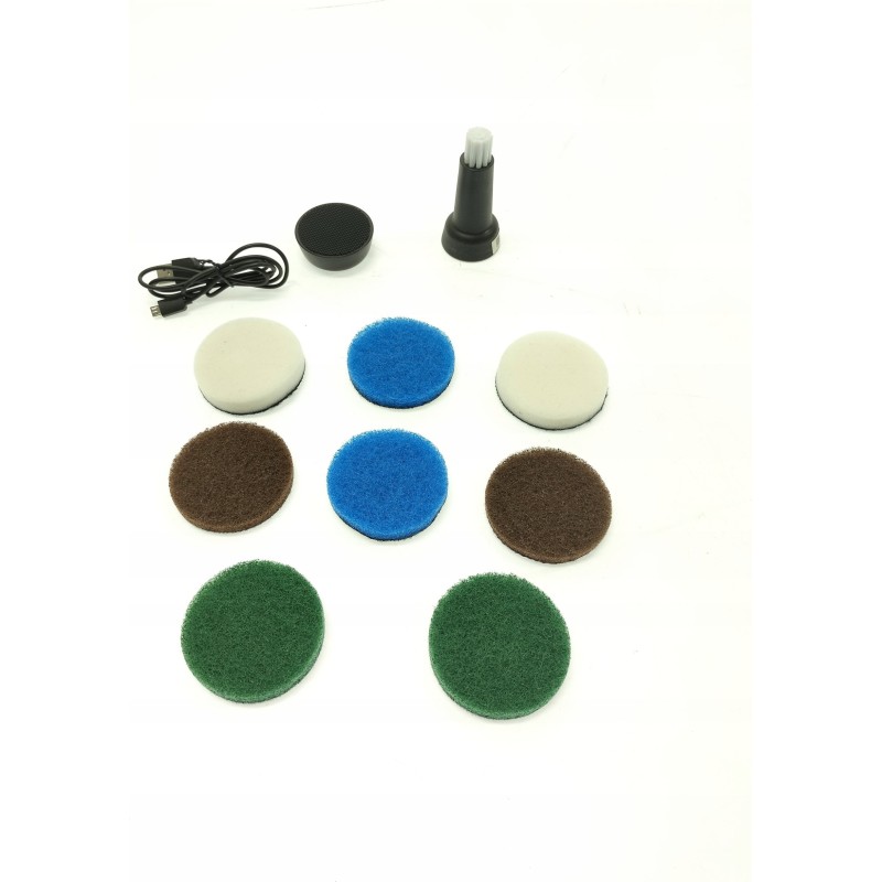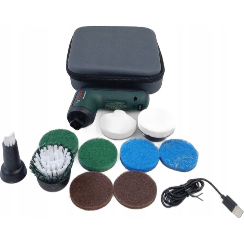 - Zubehörset: 2 Heavy-Duty-Pads, 2 Mikrofaser-Pads, 2 Melamin-Pads, 2 Küchenpads, Pad-Halter, breite Bürste, Präzisionsbürste, USB-Kabel zum Aufladen des Akkus, Etui aus strapazierfähigem Stoff.
